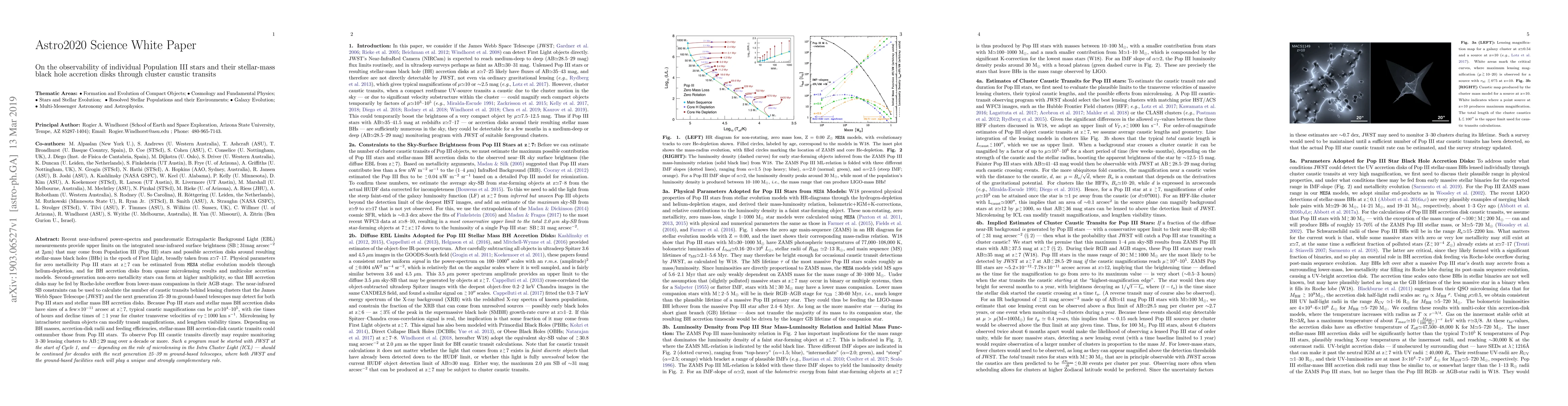 Recent near-IR power-spectra and panchromatic Extragalactic Background Light measurements provide upper limits on the near-IR surface brightness (SB>31 mag/arcsec^2) that may come from Pop III stars and accretion disks around resulting stellar-mass black holes (BHs) in the epoch of First Light (z=7-17). Physical parameters for zero metallicity Pop III stars at z>7 can be estimated from MESA stellar evolution models through helium-depletion, and for BH accretion disks from quasar microlensing results and multicolor accretion models. Second-generation stars can form at higher multiplicity, so that BH accretion disks may be fed by Roche-lobe overflow from lower-mass companions in their AGB stage. The near-IR SB constraints can be used to calculate the number of caustic transits behind lensing clusters that JWST and the 25~39 m ground-based telescopes may detect for both Pop III stars and stellar mass BH accretion disks. Because Pop III stars and stellar mass BH accretion disks have sizes of a few x 10^-11 arcsec at z>7, typical caustic magnifications can be mu=10^4~10^5, with rise times of hours and decline times of < 1 year for cluster transverse velocities of v<1000 km/s. Microlensing by intracluster medium objects can modify transit magnifications, and lengthen visibility times. Depending on BH masses, accretion-disk radii and feeding efficiencies, stellar-mass BH accretion-disk caustic transits could outnumber those from Pop III stars. To observe Pop III caustic transits directly may require monitoring 3~30 lensing clusters to AB< 29 mag over a decade or more. Such a program must be started with JWST in Cycle 1, and -- depending on the role of microlensing in the Intra Cluster Light -- should be continued for decades with the GMT and TMT, where JWST and the ground-based telescopes each will play a unique and strongly complementary role.
