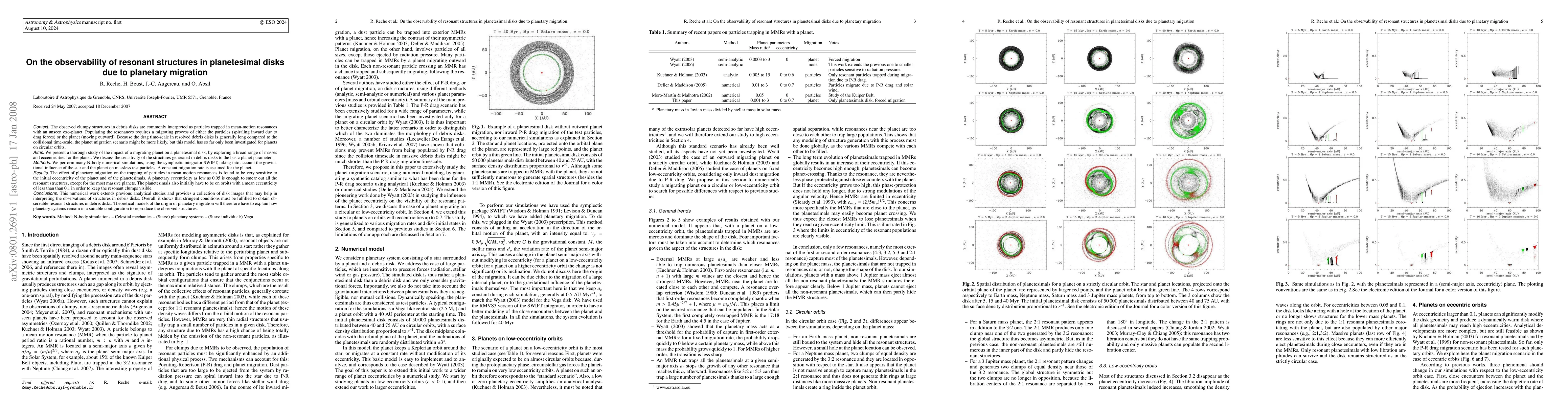 We present a thorough study of the impact of a migrating planet on a planetesimal disk, by exploring a broad range of masses and eccentricities for the planet. We discuss the sensitivity of the structures generated in debris disks to the basic planet parameters. We perform many N-body numerical simulations, using the symplectic integrator SWIFT, taking into account the gravitational influence of the star and the planet on massless test particles. A constant migration rate is assumed for the planet. The effect of planetary migration on the trapping of particles in mean motion resonances is found to be very sensitive to the initial eccentricity of the planet and of the planetesimals. A planetary eccentricity as low as 0.05 is enough to smear out all the resonant structures, except for the most massive planets. The planetesimals also initially have to be on orbits with a mean eccentricity of less than than 0.1 in order to keep the resonant clumps visible. This numerical work extends previous analytical studies and provides a collection of disk images that may help in interpreting the observations of structures in debris disks. Overall, it shows that stringent conditions must be fulfilled to obtain observable resonant structures in debris disks. Theoretical models of the origin of planetary migration will therefore have to explain how planetary systems remain in a suitable configuration to reproduce the observed structures.