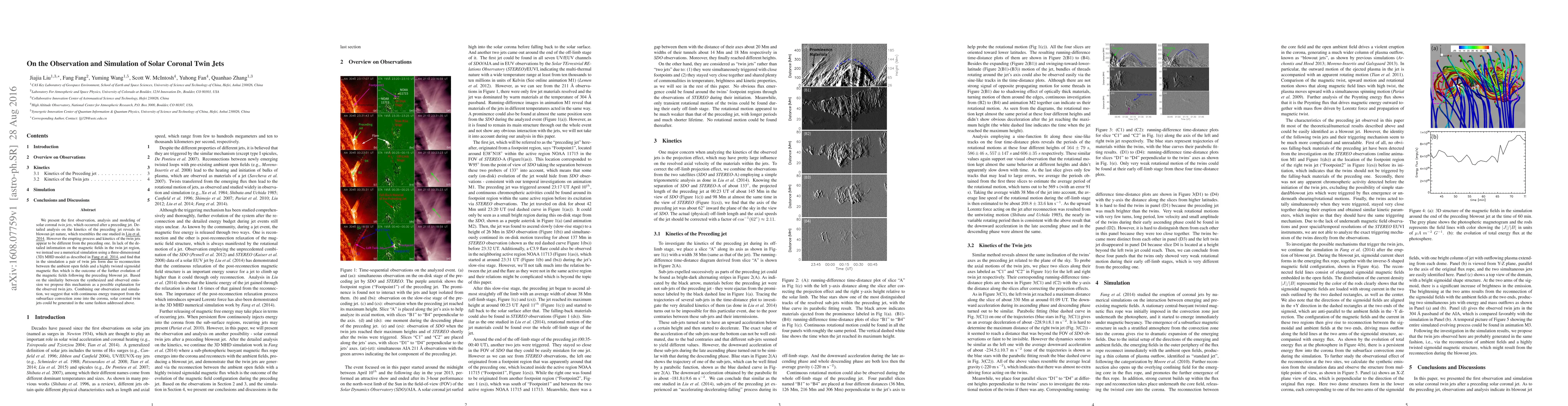 We present the first observation, analysis and modeling of solar coronal twin jets, which occurred after a preceding jet. Detailed analysis on the kinetics of the preceding jet reveals its blowout-jet nature, which resembles the one studied in Liu et al. 2014. However the erupting process and kinetics of the twin jets appear to be different from the preceding one. In lack of the detailed information on the magnetic fields in the twin jet region, we instead use a numerical simulation using a three-dimensional (3D) MHD model as described in Fang et al. 2014, and find that in the simulation a pair of twin jets form due to reconnection between the ambient open fields and a highly twisted sigmoidal magnetic flux which is the outcome of the further evolution of the magnetic fields following the preceding blowout jet. Based on the similarity between the synthesized and observed emission we propose this mechanism as a possible explanation for the observed twin jets. Combining our observation and simulation, we suggest that with continuous energy transport from the subsurface convection zone into the corona, solar coronal twin jets could be generated in the same fashion addressed above.