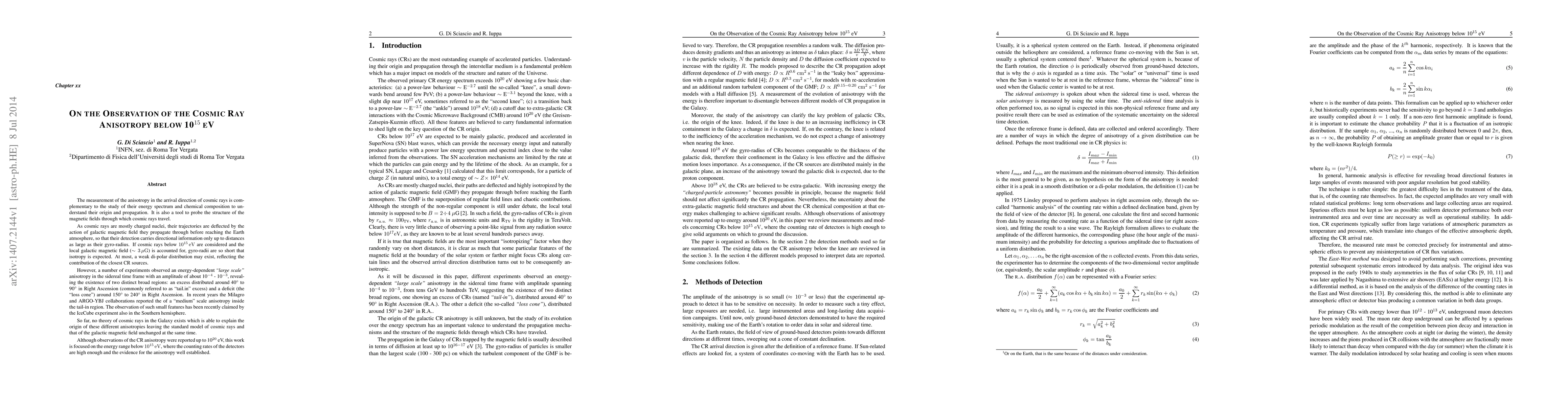 The measurement of the anisotropy in the arrival direction of cosmic rays is complementary to the study of their energy spectrum and chemical composition to understand their origin and propagation. It is also a tool to probe the structure of the magnetic fields through which cosmic rays travel. As cosmic rays are mostly charged nuclei, their trajectories are deflected by the action of galactic magnetic field they propagate through before reaching the Earth atmosphere, so that their detection carries directional information only up to distances as large as their gyro-radius. If cosmic rays below $10^{15}{\rm\,eV}$ are considered and the local galactic magnetic field ($\sim3{\rm\,\mu G}$) is accounted for, gyro-radii are so short that isotropy is expected. At most, a weak di-polar distribution may exist, reflecting the contribution of the closest CR sources. However, a number of experiments observed an energy-dependent \emph{"large scale"} anisotropy in the sidereal time frame with an amplitude of about 10$^{-4}$ - 10$^{-3}$, revealing the existence of two distinct broad regions: an excess distributed around 40$^{\circ}$ to 90$^{\circ}$ in Right Ascension (commonly referred to as "tail.in" excess) and a deficit (the "loss cone") around 150$^{\circ}$ to 240$^{\circ}$ in Right Ascension. In recent years the Milagro and ARGO-YBJ collaborations reported the of a "medium" scale anisotropy inside the tail-in region. The observation of such small features has been recently claimed by the IceCube experiment also in the Southern hemisphere. So far, no theory of cosmic rays in the Galaxy exists which is able to explain the origin of these different anisotropies leaving the standard model of cosmic rays and that of the galactic magnetic field unchanged at the same time.
