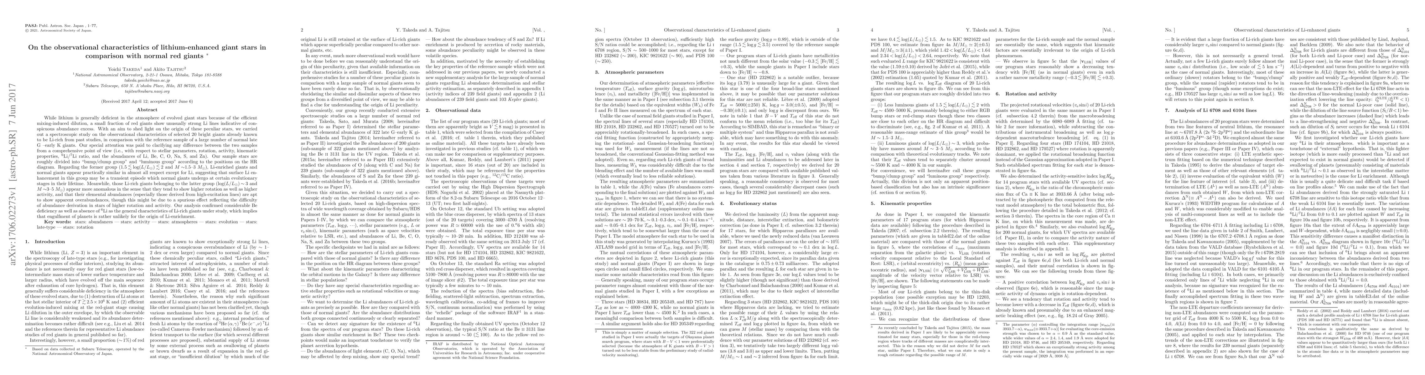 With an aim to shed light on the origin of Li anomaly observed in a small fraction of red giants, we carried out a spectroscopic study on the observational characteristics of selected 20 bright Li-rich giants, in comparison with a large number of normal late G-early K giants, where special attention was paid to clarifying any difference between two samples with respect to stellar parameters, rotation, activity, kinematic properties, and chemical abundances of Li, Be, C, O, Na, S, and Zn). Our targets are roughly divided into 'bump/clump group' and 'luminous group' according to the position on the HR diagram. Regarding the former group, Li-enriched giants and the corresponding normal giants appear practically similar except for Li, suggesting that surface Li enhancement in this group may be a transient episode which normal giants undergo at some certain evolutionary stage. Meanwhile, those Li-rich giants belonging to the latter group appear more anomalous in the sense that they tend to show larger rotational velocities, and that their elemental abundances (e.g., those of C and O derived from high-excitation lines) are apt to show apparent overabundances, though this might be due to some spurious effect reflecting the difficulty of abundance derivation in stars of higher rotation and activity. Our analysis confirmed considerable Be deficiency as well as absence of 6Li as the general characteristics of Li-rich giants under study, which implies that engulfment of planets is rather unlikely for the cause of Li-enrichment.