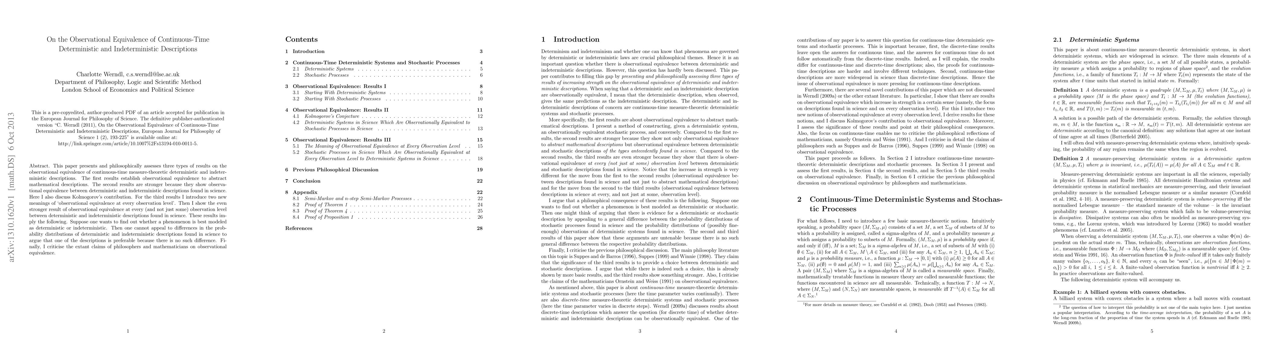This paper presents and philosophically assesses three types of results on the observational equivalence of continuous-time measure-theoretic deterministic and indeterministic descriptions. The first results establish observational equivalence to abstract mathematical descriptions. The second results are stronger because they show observational equivalence between deterministic and indeterministic descriptions found in science. Here I also discuss Kolmogorov's contribution. For the third results I introduce two new meanings of `observational equivalence at every observation level'. Then I show the even stronger result of observational equivalence at every (and not just some) observation level between deterministic and indeterministic descriptions found in science. These results imply the following. Suppose one wants to find out whether a phenomenon is best modeled as deterministic or indeterministic. Then one cannot appeal to differences in the probability distributions of deterministic and indeterministic descriptions found in science to argue that one of the descriptions is preferable because there is no such difference. Finally, I criticise the extant claims of philosophers and mathematicians on observational equivalence.