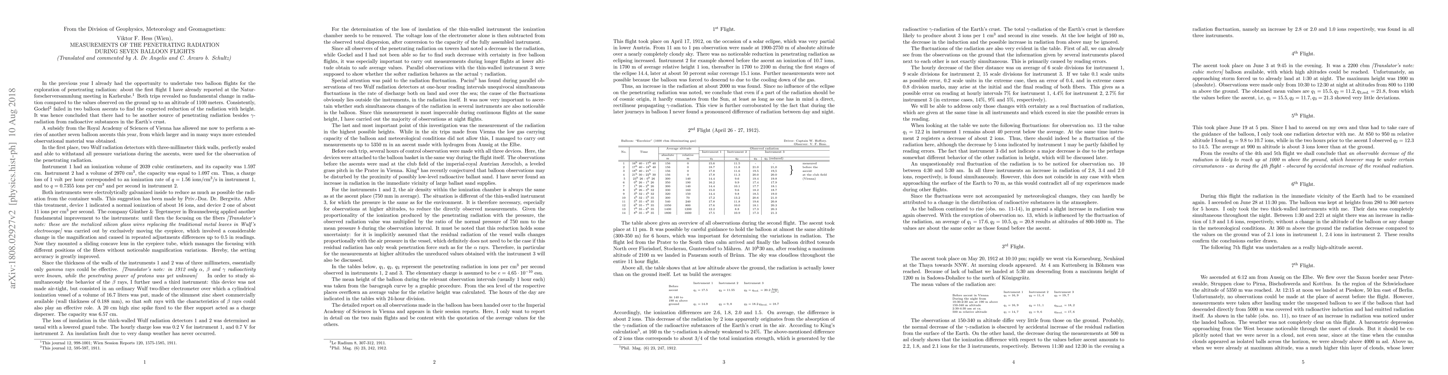 At the beginning of the twentieth century, the Austrian (later naturalized American) Victor Hess among others developed a brilliant line of research, leading to the final determination of the extraterrestrial origin of part of the atmospheric radiation. Before his work, the origin of the radiation today called "cosmic rays" was strongly debated, as many scientists thought that these particles came integrally from the crust of the Earth. There was however an active and rich research on the topic. Victor (at that time Viktor) Hess measured in 1912 the rate of discharge of an electroscope that flew aboard an atmospheric balloon. Since the discharge rate increased as the balloon flew at higher altitude, he concluded that the origin of part of the natural radiation could not be terrestrial. For this discovery, Hess was awarded the Nobel Prize in 1936, and his experiment became legendary. The fundamental article published by Victor Hess in 1912, reporting a significant increase of the radiation as altitude increases, is translated and commented here. The decisive measurement was performed in the last of the seven flights on aerostatic balloon described.