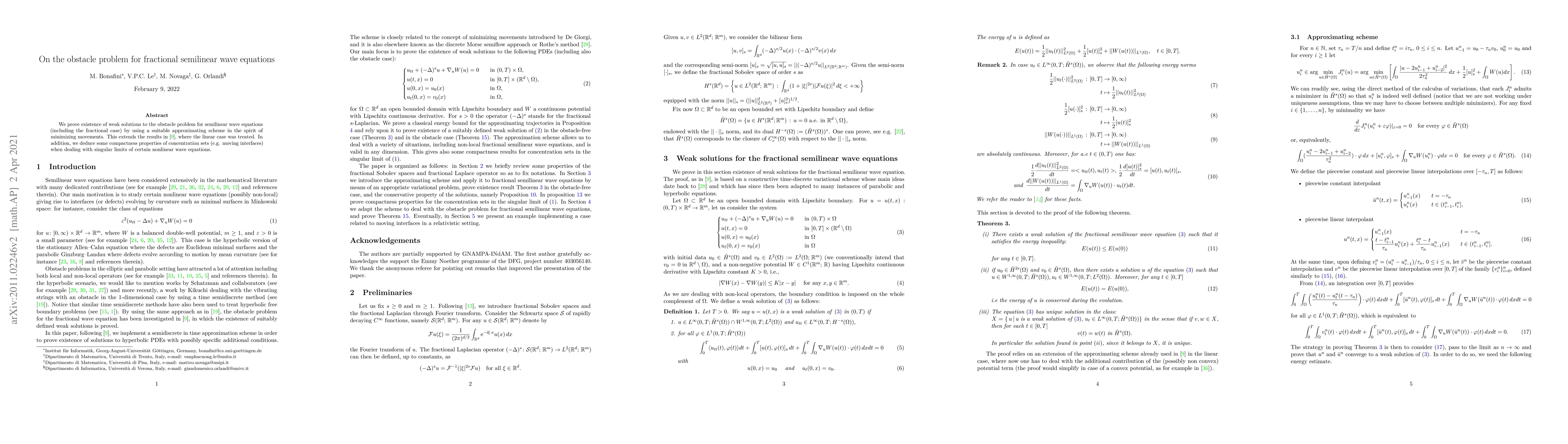 This paper proves the existence of weak solutions to the obstacle problem for fractional semilinear wave equations, extending previous results for linear cases. It also explores the compactness properties of concentration sets in singular limits of nonlinear wave equations.