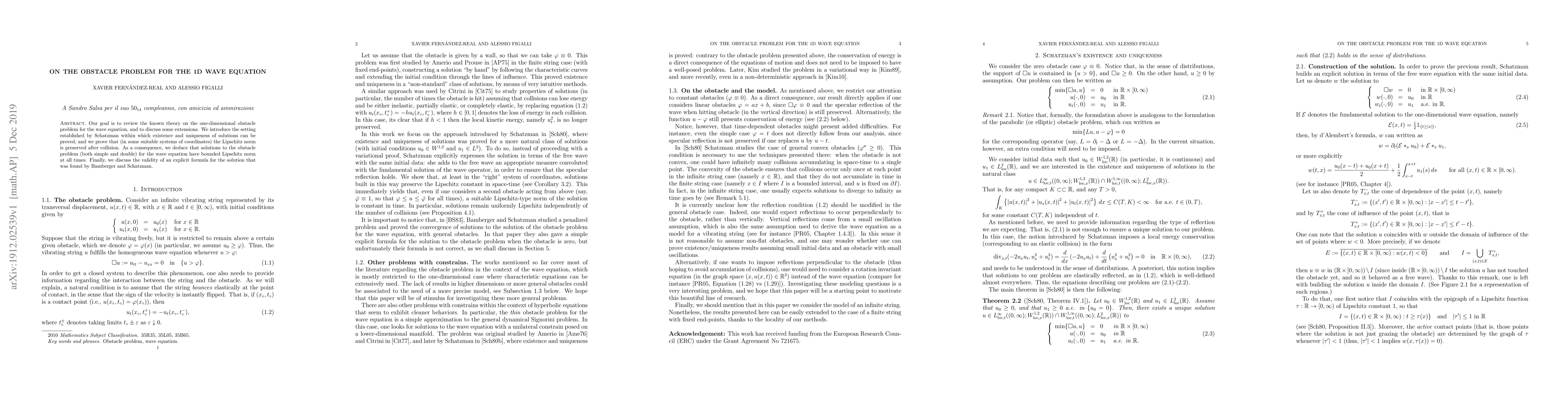 Our goal is to review the known theory on the one-dimensional obstacle problem for the wave equation, and to discuss some extensions. We introduce the setting established by Schatzman within which existence and uniqueness of solutions can be proved, and we prove that (in some suitable systems of coordinates) the Lipschitz norm is preserved after collision. As a consequence, we deduce that solutions to the obstacle problem (both simple and double) for the wave equation have bounded Lipschitz norm at all times. Finally, we discuss the validity of an explicit formula for the solution that was found by Bamberger and Schatzman.