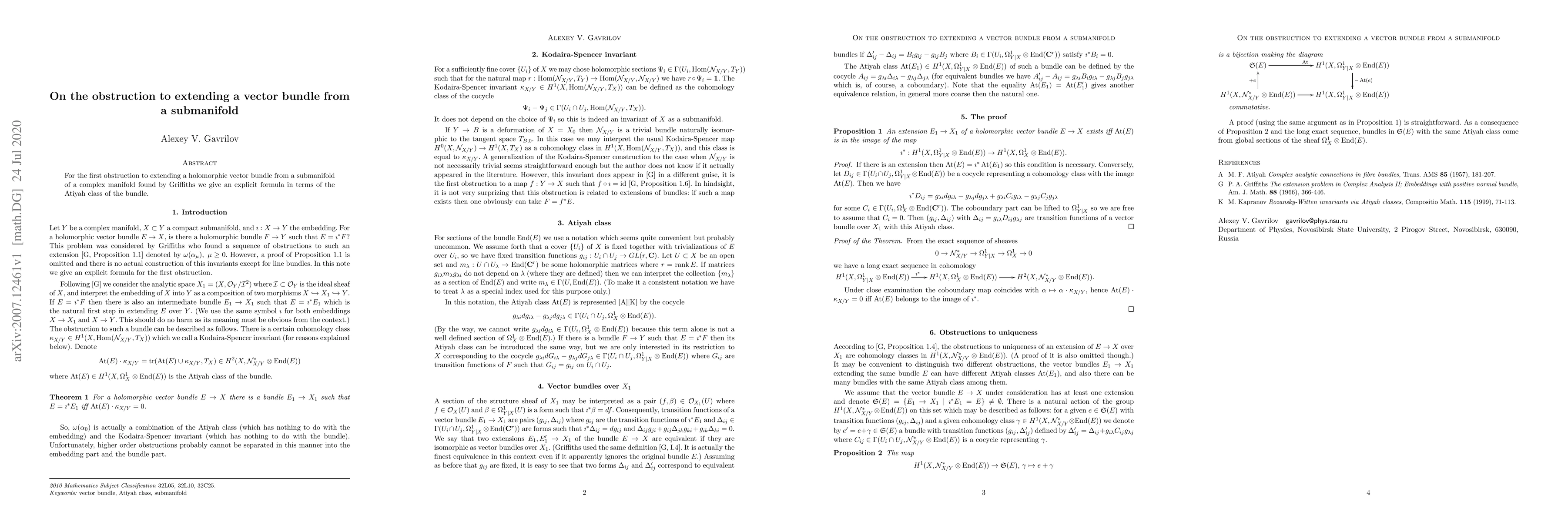 For the first obstruction to extending a holomorphic vector bundle from a submanifold of a complex manifold found by Griffiths we give an explicit formula in terms of the Atiyah class of the bundle.