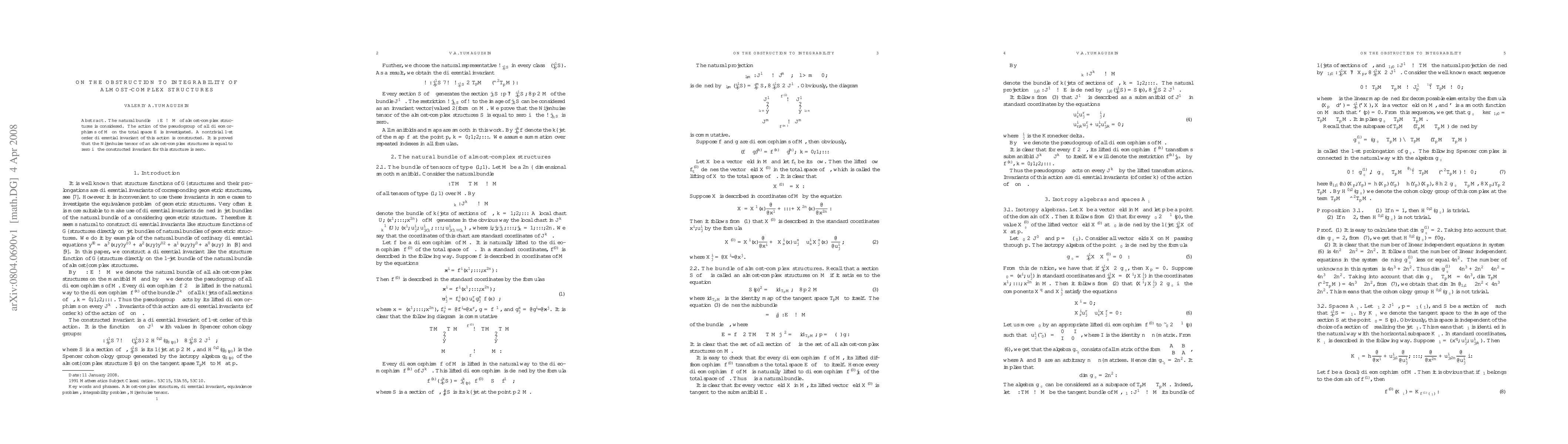 This paper investigates the action of diffeomorphisms on the bundle of almost-complex structures and constructs a nontrivial first-order differential invariant. It proves that an almost-complex structure is integrable if and only if this invariant is zero.
