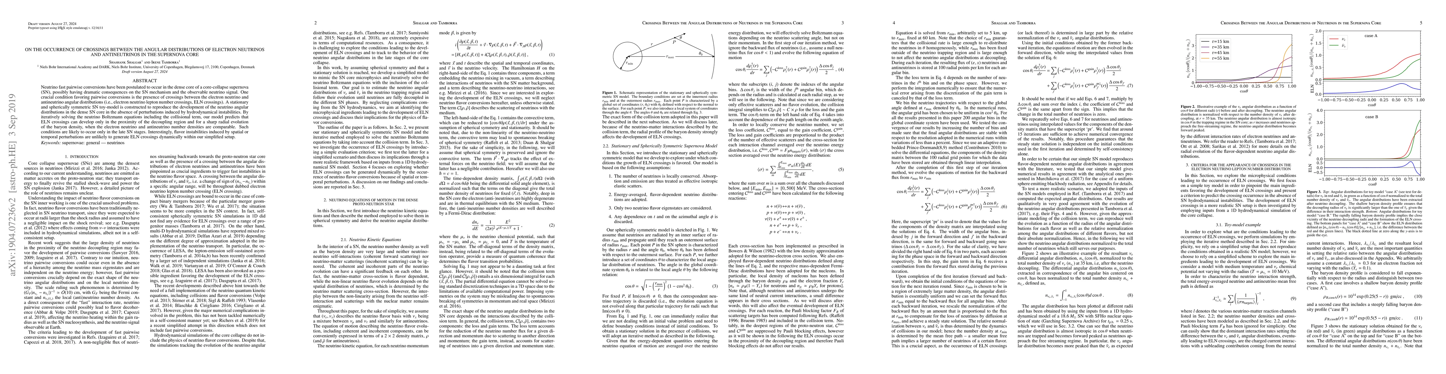 Neutrino fast pairwise conversions have been postulated to occur in the dense core of a core-collapse supernova (SN), possibly having dramatic consequences on the SN mechanism and the observable neutrino signal. One crucial condition favoring pairwise conversions is the presence of crossings between the electron neutrino and antineutrino angular distributions (i.e., electron neutrino lepton number crossings, ELN crossings). A stationary and spherically symmetric SN toy-model is constructed to reproduce the development of the neutrino angular distributions in the dense SN core in the absence of perturbations induced by hydrodynamical instabilities. By iteratively solving the neutrino Boltzmann equations including the collisional term, our model predicts that ELN crossings can develop only in the proximity of the decoupling region and for a sharp radial evolution of the baryon density, when the electron neutrino and antineutrino number densities are comparable. Such conditions are likely to occur only in the late SN stages. Interestingly, flavor instabilities induced by spatial or temporal perturbations are unlikely to generate ELN crossings dynamically within our simplified setup.