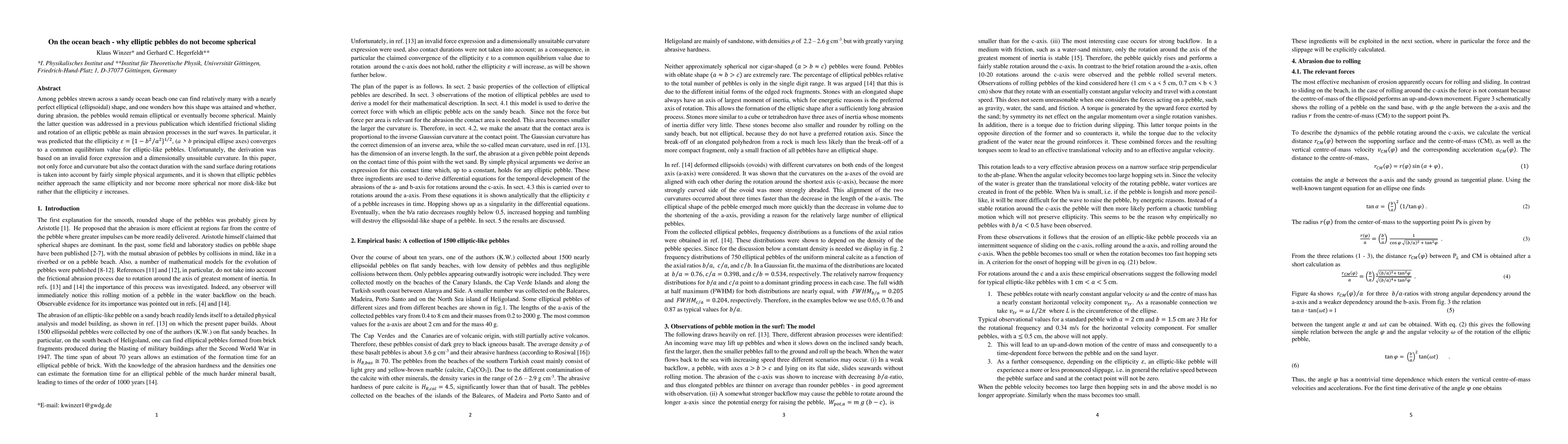 Among pebbles strewn across a sandy ocean beach one can find relatively many with a nearly perfect elliptical (ellipsoidal) shape, and one wonders how this shape was attained and whether, during abrasion, the pebbles would remain elliptical or eventually become spherical. Mainly the latter question was addressed in a previous publication which identified frictional sliding and rotation of an elliptic pebble as main abrasion processes in the surf waves. In particular, it was predicted that the ellipticity $\epsilon$ converges to a common equilibrium value for elliptic-like pebbles. Unfortunately, the derivation was based on an invalid force expression and a dimensionally unsuitable curvature. In this paper, not only force and curvature but also the contact duration with the sand surface during rotations is taken into account by fairly simple physical arguments, and it is shown that elliptic pebbles neither approach the same ellipticity and nor become more spherical nor more disk-like but rather that the ellipticity $\epsilon$ increases.