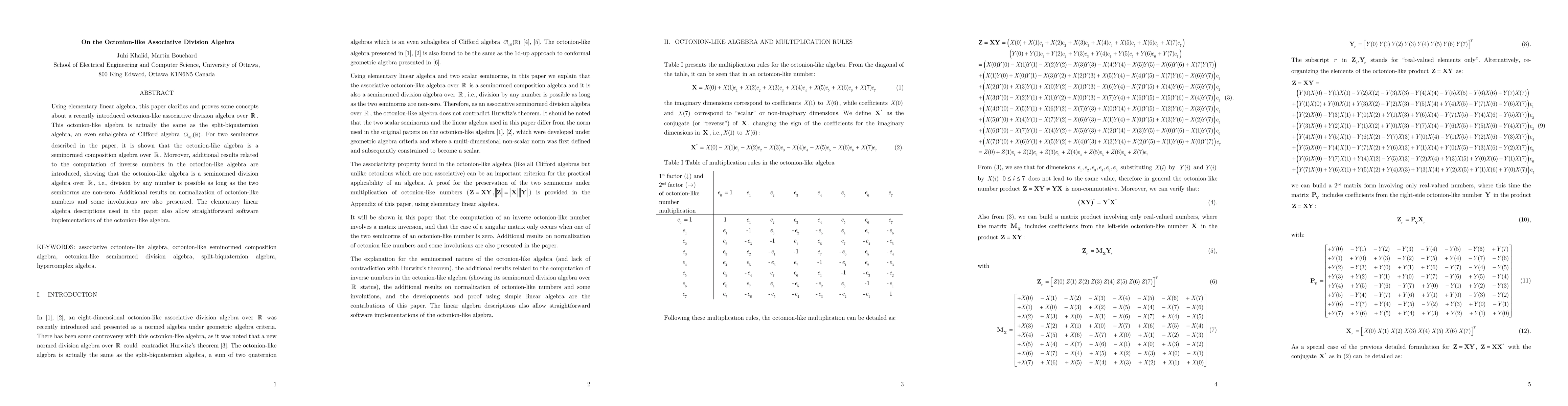 Using elementary linear algebra, this paper clarifies and proves some concepts about a recently introduced octonion-like associative division algebra over R. This octonion-like algebra is actually the same as the split-biquaternion algebra, an even subalgebra of Clifford algebra Cl(4,0). For two seminorms described in the paper, it is shown that the octonion-like algebra is a seminormed composition algebra over R. Moreover, additional results related to the computation of inverse numbers in the octonion-like algebra are introduced, showing that the octonion-like algebra is a seminormed division algebra over R, i.e., division by any number is possible as long as the two seminorms are non-zero. Additional results on normalization of octonion-like numbers and some involutions are also presented. The elementary linear algebra descriptions used in the paper also allow straightforward software implementations of the octonion-like algebra.