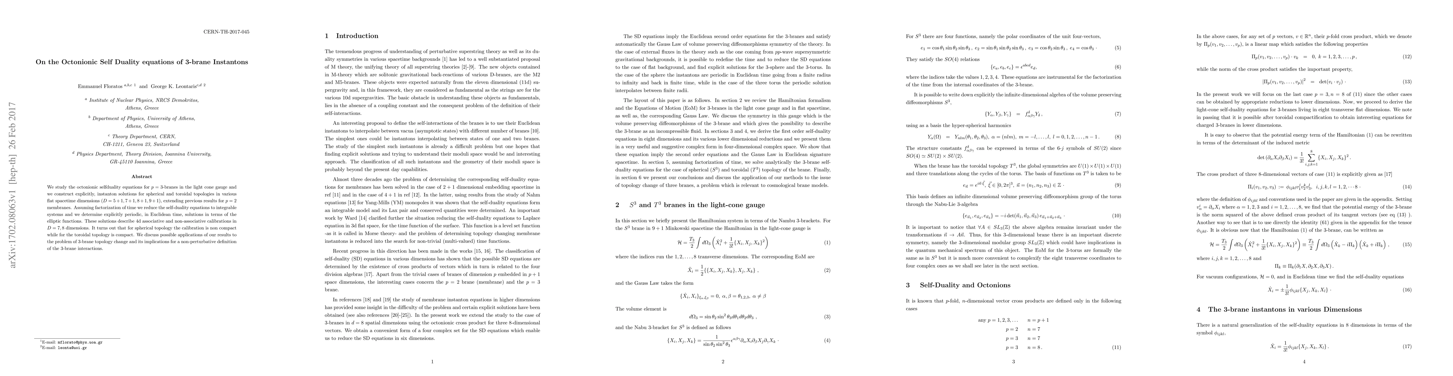 This paper investigates the octonionic self-duality equations for 3-branes, constructing instanton solutions for spherical and toroidal topologies in various dimensions. It provides explicit periodic solutions in Euclidean time using elliptic functions, revealing non-compact calibration for spherical and compact for toroidal topology, and discusses implications for 3-brane topology change and interactions.