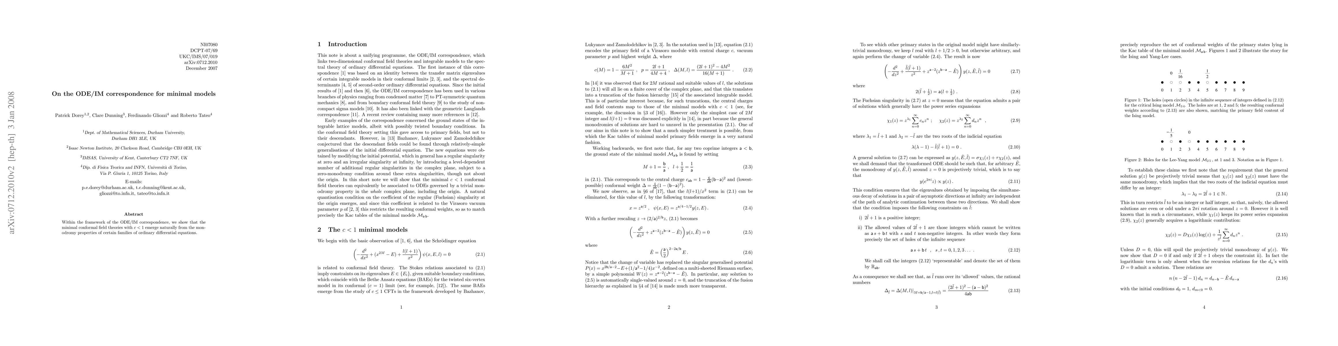 Summary: This paper explores the ODE/IM correspondence and demonstrates that minimal conformal field theories with central charge c<1 arise naturally from the monodromy properties of specific families of ordinary differential equations. The findings provide a deeper understanding of the relationship between differential equations and minimal models in conformal field theory.