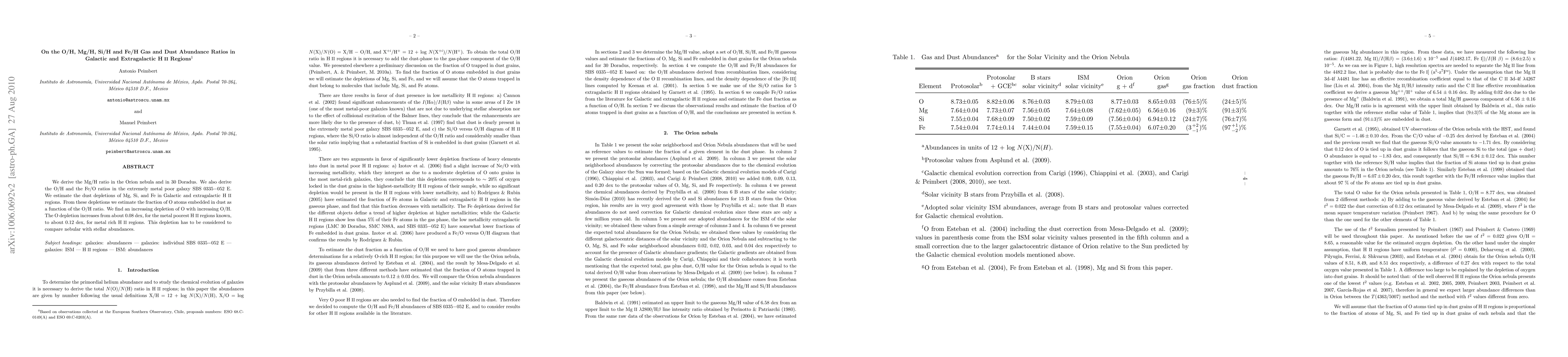 This paper derives Mg/H ratios in the Orion nebula and 30 Doradus, and O/H, Fe/O ratios in the galaxy SBS 0335-052. It estimates dust depletions of Mg, Si, and Fe in Galactic and extragalactic H II regions, finding an increasing oxygen depletion with higher O/H ratios, which must be accounted for when comparing nebular and stellar abundances.