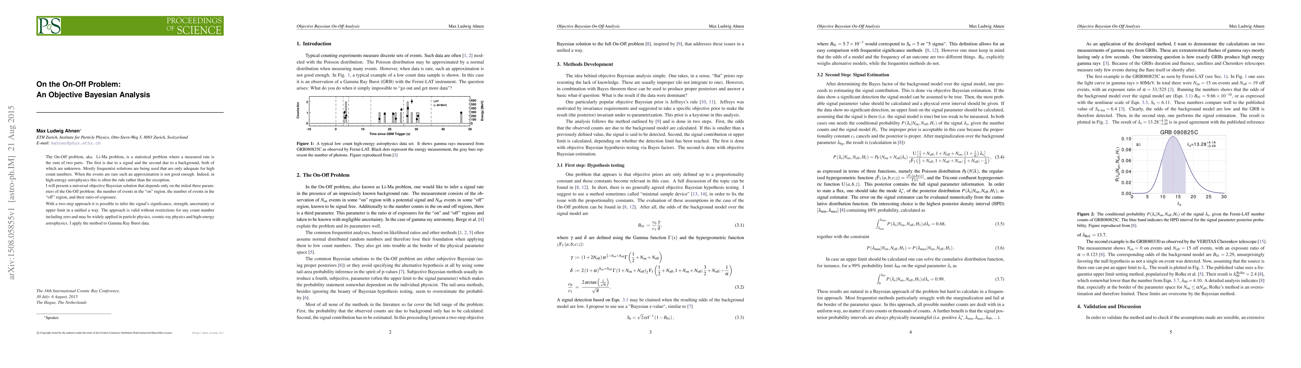 The On-Off problem, aka. Li-Ma problem, is a statistical problem where a measured rate is the sum of two parts. The first is due to a signal and the second due to a background, both of which are unknown. Mostly frequentist solutions are being used that are only adequate for high count numbers. When the events are rare such an approximation is not good enough. Indeed, in high-energy astrophysics this is often the rule rather than the exception. I will present a universal objective Bayesian solution that depends only on the initial three parameters of the On-Off problem: the number of events in the "on" region, the number of events in the "off" region, and their ratio-of-exposure. With a two-step approach it is possible to infer the signal's significance, strength, uncertainty or upper limit in a unified a way. The approach is valid without restrictions for any count number including zero and may be widely applied in particle physics, cosmic-ray physics and high-energy astrophysics. I apply the method to Gamma Ray Burst data.