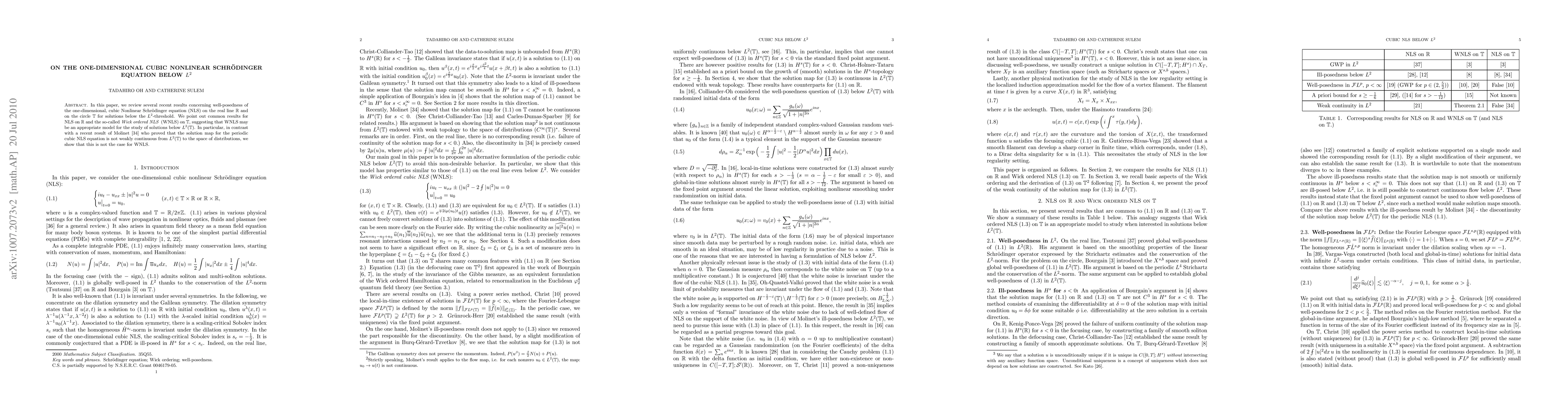 This paper reviews recent findings on the well-posedness of the one-dimensional cubic Nonlinear Schrödinger equation (NLS) below the L^2-threshold, comparing results for NLS on the real line and the "Wick ordered NLS" (WNLS) on the circle, and demonstrating that WNLS maintains weak continuity unlike periodic NLS.