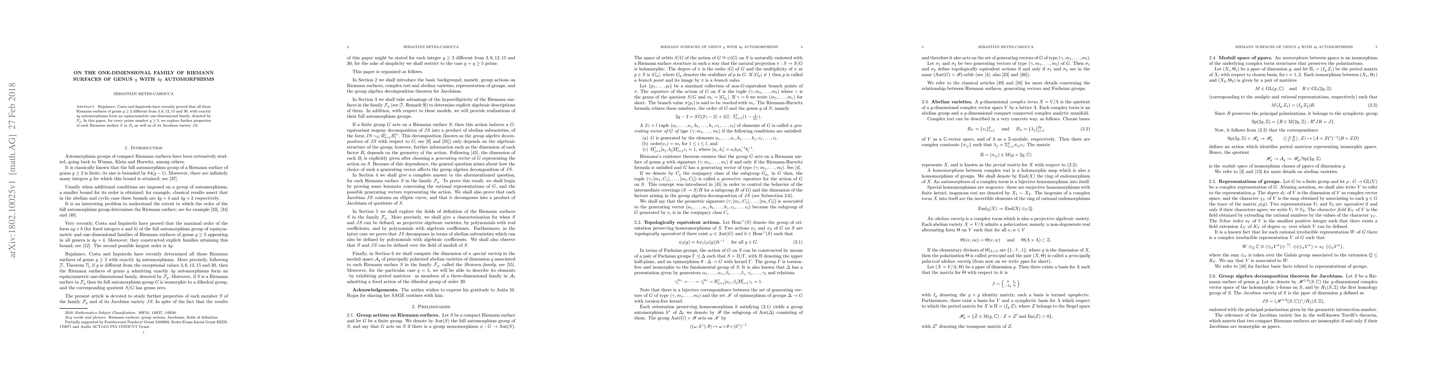 This paper investigates the properties of a one-dimensional family of Riemann surfaces of genus $q$ with $4q$ automorphisms, proving their equisymmetry and exploring the characteristics of each surface $S$ in $\mathcal{F}_q$ and its Jacobian variety $JS$ for prime $q \ge 5$.