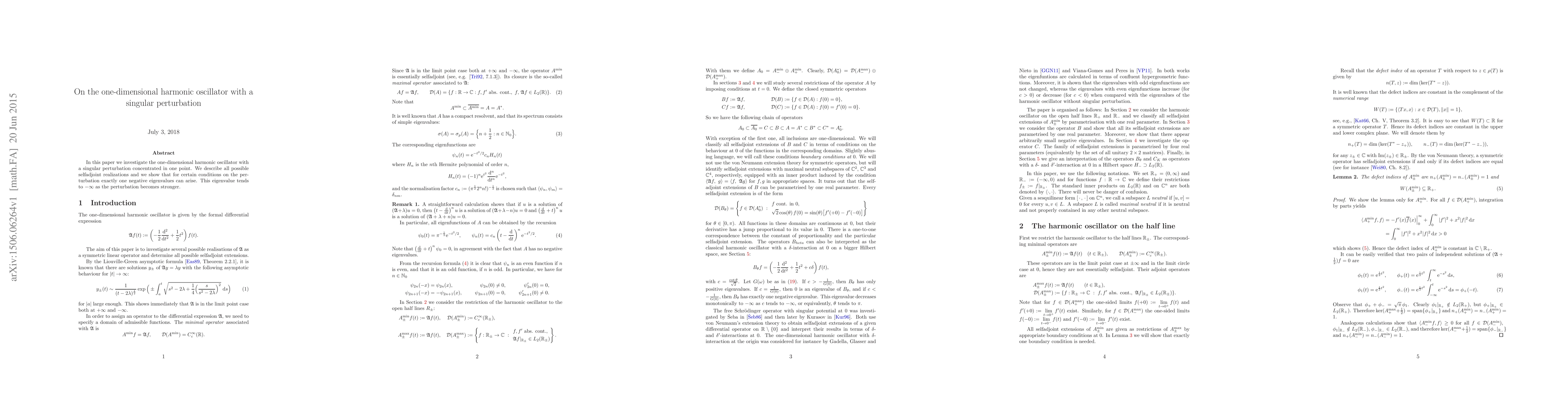 This paper explores the one-dimensional harmonic oscillator with a singular perturbation at a single point, detailing all selfadjoint realizations and demonstrating that under specific conditions, exactly one negative eigenvalue emerges, tending towards $-\infty$ with increasing perturbation strength.