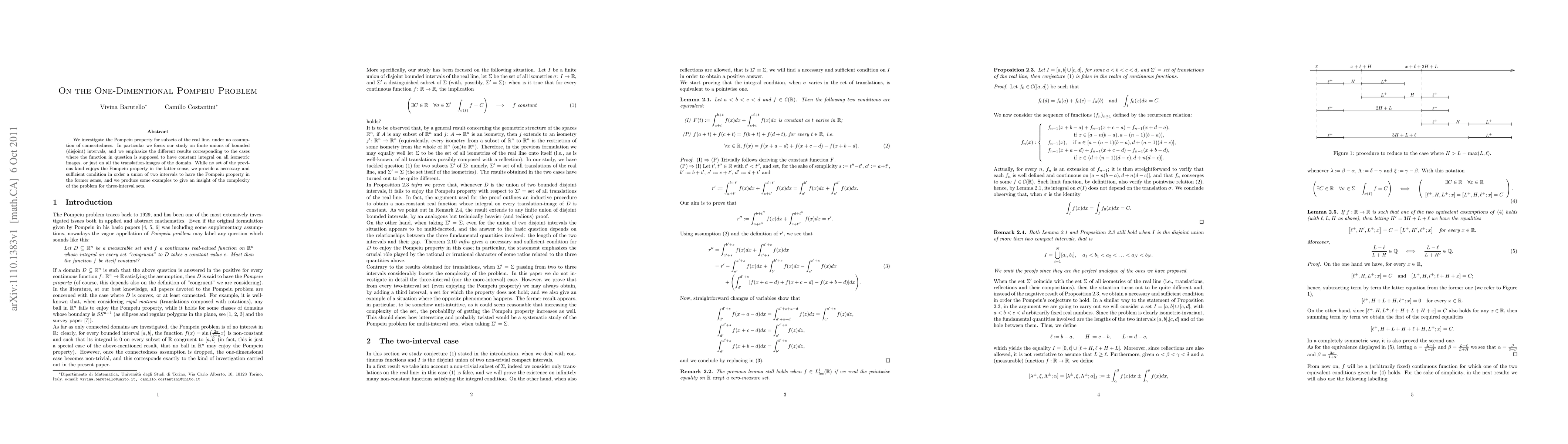 We investigate the Pompeiu property for subsets of the real line, under no assumption of connectedness. In particular we focus our study on finite unions of bounded (disjoint) intervals, and we emphasize the different results corresponding to the cases where the function in question is supposed to have constant integral on all isometric images, or just on all the translation-images of the domain. While no set of the previous kind enjoys the Pompeiu property in the latter sense, we provide a necessary and sufficient condition in order a union of two intervals to have the Pompeiu property in the former sense, and we produce some examples to give an insight of the complexity of the problem for three-interval sets.