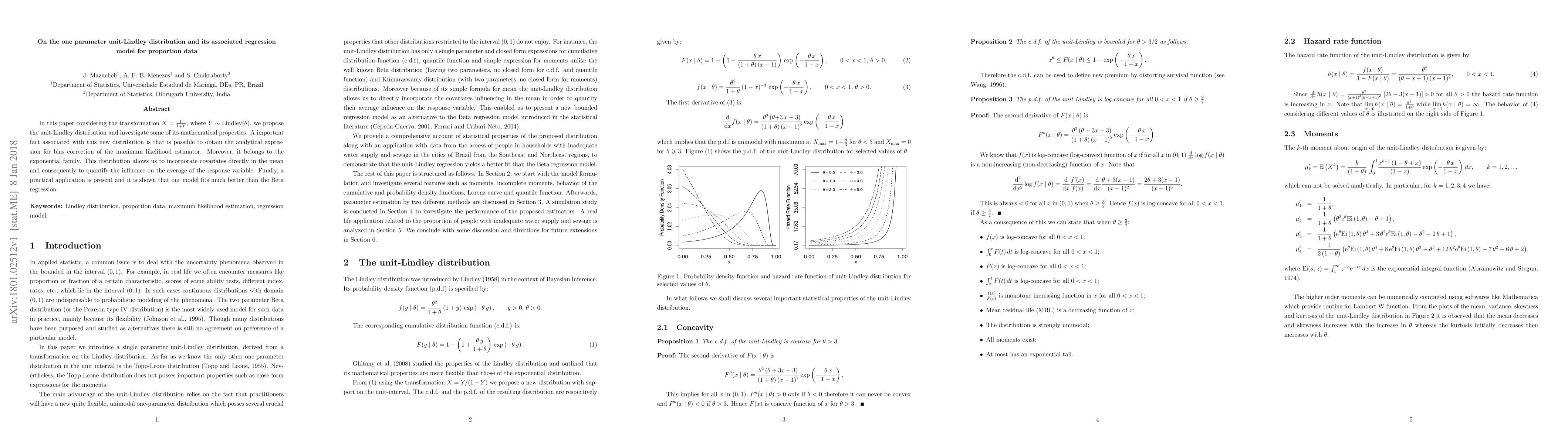 This paper introduces the unit-Lindley distribution derived from the Lindley distribution via a transformation, highlighting its analytical properties and bias correction for the maximum likelihood estimator. The distribution is shown to fit proportion data better than Beta regression in practical applications.