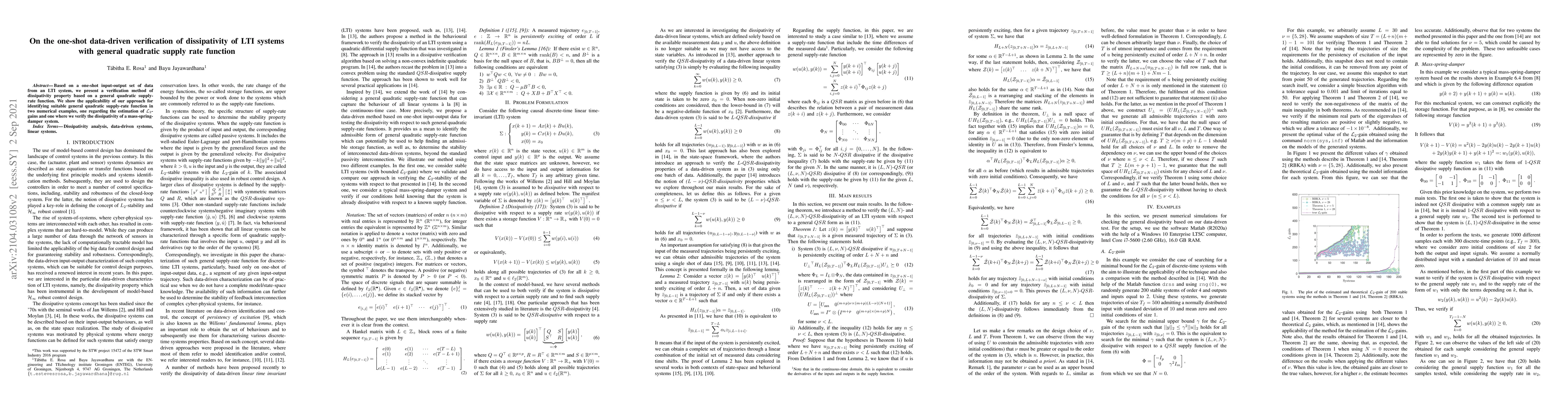 Based on a one-shot input-output set of data from an LTI system, we present a verification method of dissipativity property based on a general quadratic supply-rate function. We show the applicability of our approach for identifying suitable general quadratic supply-rate function in two numerical examples, one regarding the estimation of $\mathcal{L}_2$-gains and one where we verify the dissipativity of a mass-spring-damper system.