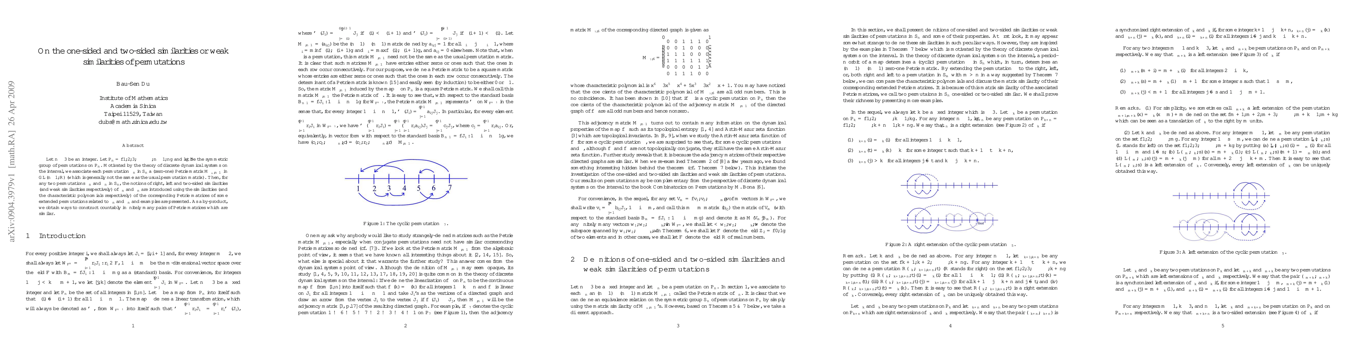 Let $n \ge 3$ be an integer. Let $P_n = \{1, 2, 3, ..., n-1, n \}$ and let $S_n$ be the symmetric group of permutations on $P_n$. Motivated by the theory of discrete dynamical systems on the interval, we associate each permutation $\si_n$ in $S_n$ a (zero-one) Petrie matrix $M_{\si_n,n-1}$ in $GL(n-1,{{\mathbb{R}}})$ (which is generally not the same as the usual permutation matrix). Then, for any two permutations $\si_n$ and $\rho_n$ in $S_n$, the notions of right, left and two-sided similarities (and weak similarities respectively) of $\si_n$ and $\rho_n$ are introduced using the similarities (and the characteristic polynomials respectively) of the correspnding Petrie matrices of some extended permutations related to $\si_n$ and $\rho_n$ and examples are presented. As a by-product, we obtain ways to construct countably infinitely many pairs of Petrie matrices which are similar.