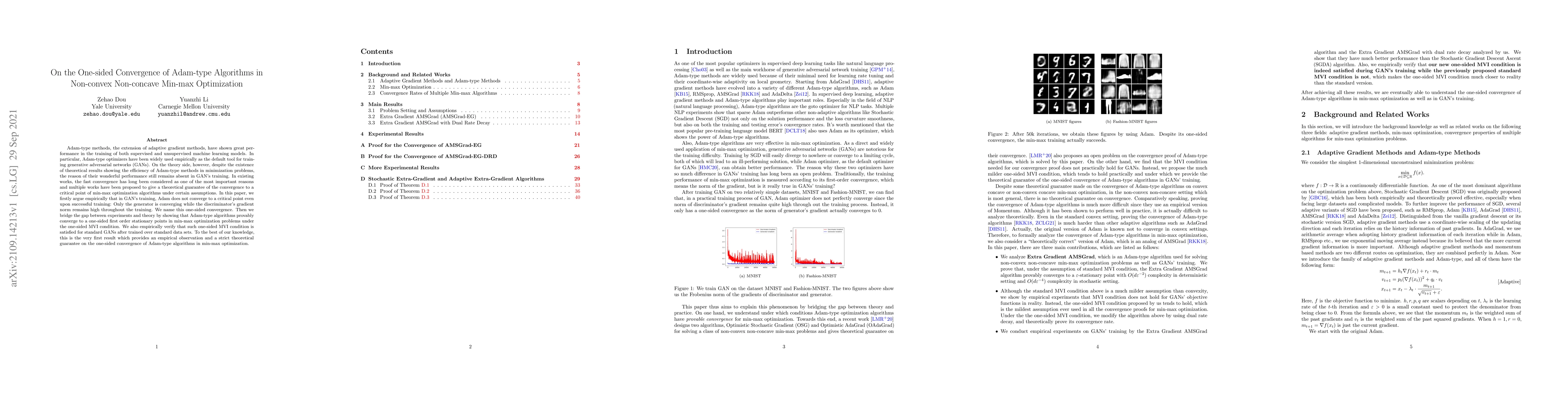 This paper investigates the one-sided convergence of Adam-type optimizers in non-convex min-max optimization, particularly in GAN training. It finds that while the generator converges, the discriminator's gradient norm remains high, leading to one-sided convergence. The authors provide theoretical guarantees for Adam-type algorithms converging to one-sided first-order stationary points under specific conditions, bridging the gap between empirical observations and theoretical understanding.