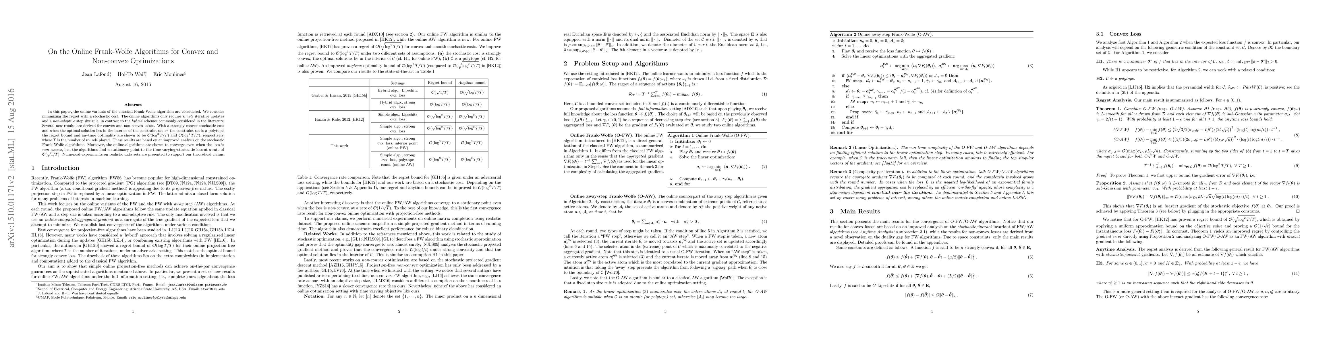 This paper introduces online variants of the Frank-Wolfe algorithm for convex and non-convex optimizations, achieving ${\cal O}( \log^3 T / T )$ regret bounds and ${\cal O}( \log^2 T / T)$ anytime optimality under certain conditions. The algorithms converge to a stationary point even for non-convex losses.