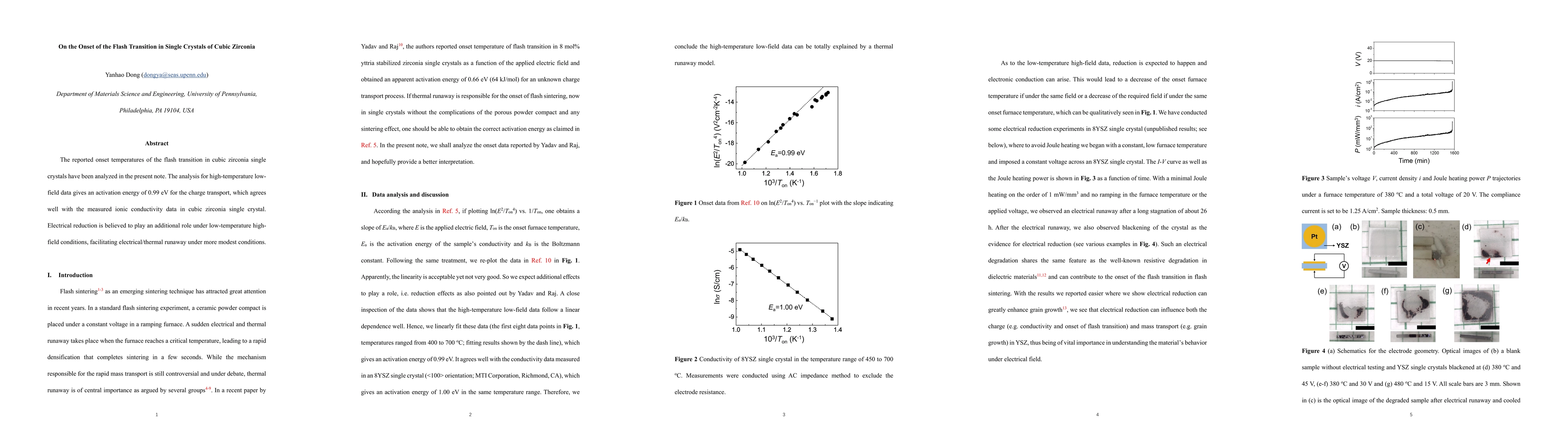 The reported onset temperatures of the flash transition in cubic zirconia single crystals have been analyzed in the present note. The analysis for high-temperature low-field data gives an activation energy of 0.99 eV for the charge transport, which agrees well with the measured ionic conductivity data in cubic zirconia single crystal. Electrical reduction is believed to play an additional role under low-temperature high-field conditions, facilitating electrical/thermal runaway under more modest conditions.