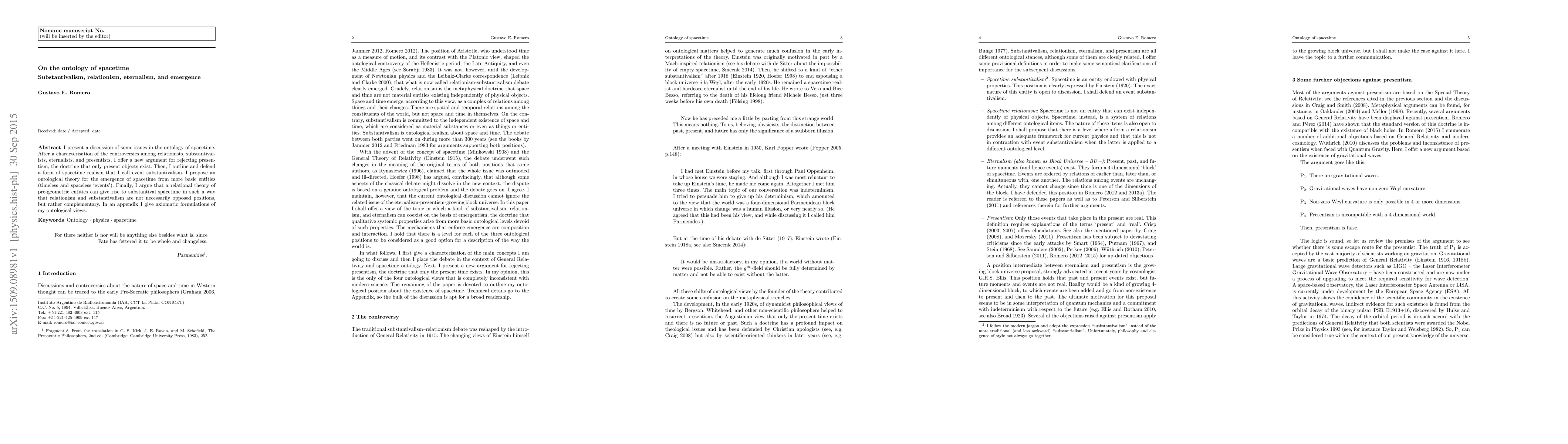 This paper discusses the ontology of spacetime, contrasting relationism, substantivalism, eternalism, and presentism. The author argues against presentism and proposes a form of spacetime realism called event substantivalism, suggesting that spacetime emerges from more fundamental entities. The paper concludes by reconciling relationism and substantivalism as complementary perspectives.
