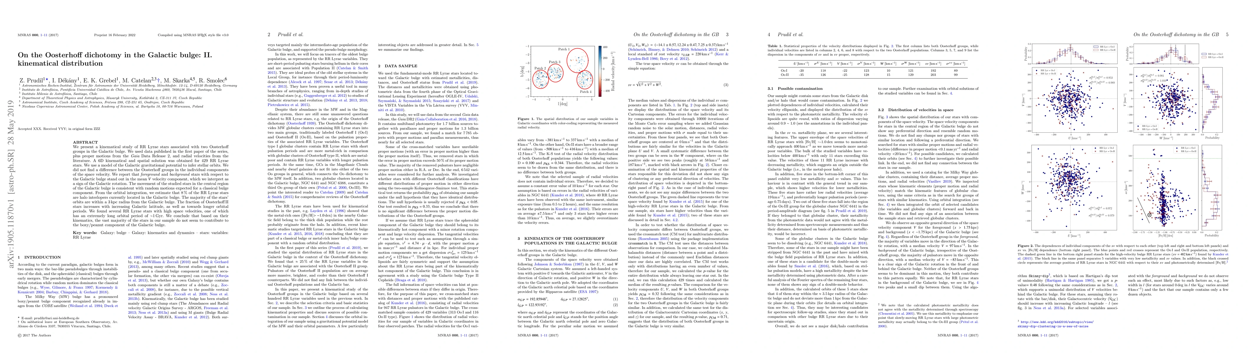 This paper investigates the kinematical distribution of RR~Lyrae stars in the Galactic bulge, finding no significant difference in space velocities between Oosterhoff groups. The majority of stars exhibit random motions typical of a classical bulge, with only 8% identified as halo interlopers.