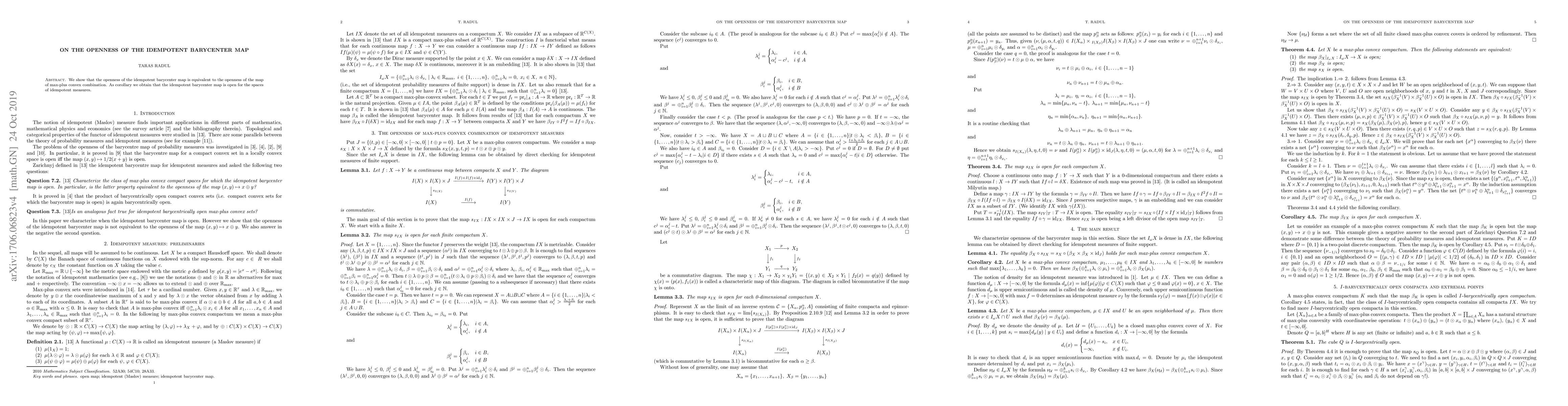 We show that the openness of the idempotent barycenter map is equivalent to the openness of the map of Max-Plus convex combination. As corollary we obtain that the idempotent barycenter map is open for the spaces of idempotent measures.
