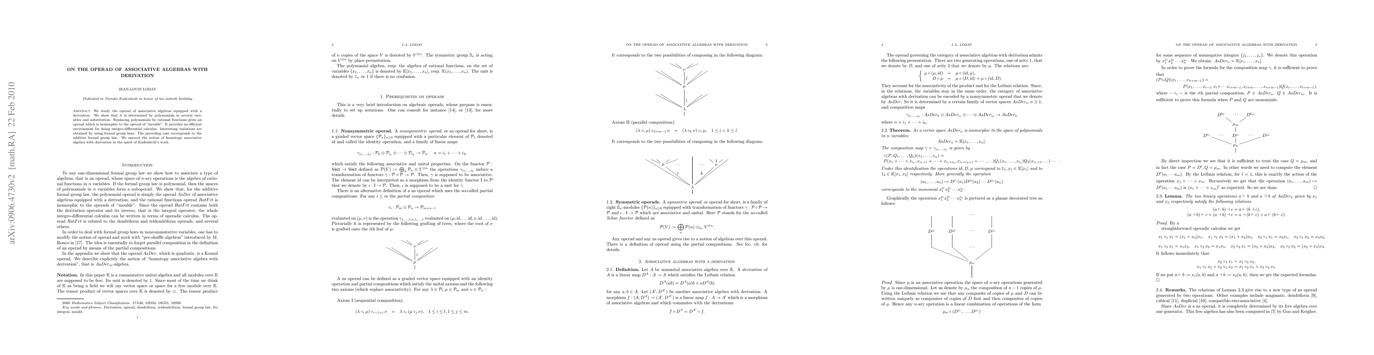 This paper explores the operad of associative algebras with derivations, showing it is defined by polynomials and substitution, and is isomorphic to the moulds operad for rational functions. It also discusses homotopy associative algebras with derivations and variations using formal group laws.