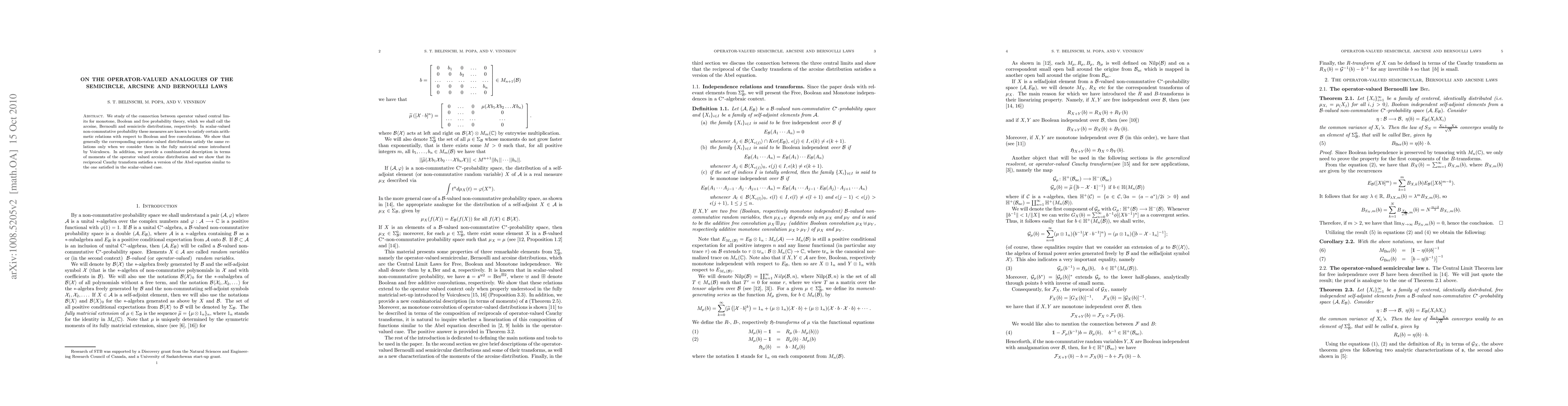 We study of the connection between operator valued central limits for monotone, Boolean and free probability theory, which we shall call the arcsine, Bernoulli and semicircle distributions, respectively. In scalar-valued non-commutative probability these measures are known to satisfy certain arithmetic relations with respect to Boolean and free convolutions. We show that generally the corresponding operator-valued distributions satisfy the same relations only when we consider them in the fully matricial sense introduced by Voiculescu. In addition, we provide a combinatorial description in terms of moments of the operator valued arcsine distribution and we show that its reciprocal Cauchy transform satisfies a version of the Abel equation similar to the one satisfied in the scalar-valued case.
