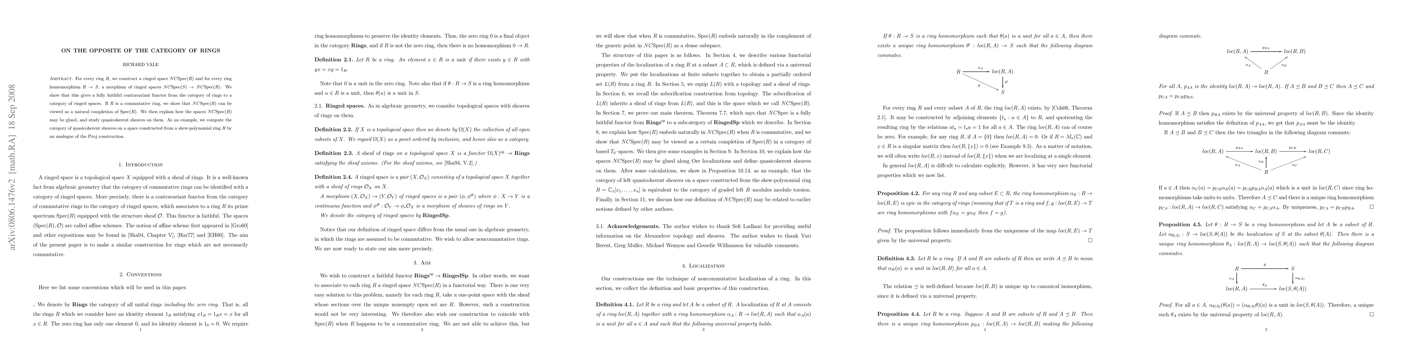 We define a faithful contravariant functor NCSpec from the category of rings to the category of ringed spaces, and show that if R is a commutative ring then NCSpec(R) may be viewed as a completion of Spec(R) in an appropriate sense. We then explain how the spaces NCSpec(R) may be glued, and study quasicoherent sheaves on them. As an example, we compute the category of quasicoherent sheaves on a space constructed from a skew-polynomial ring R by an analogue of the Proj construction.