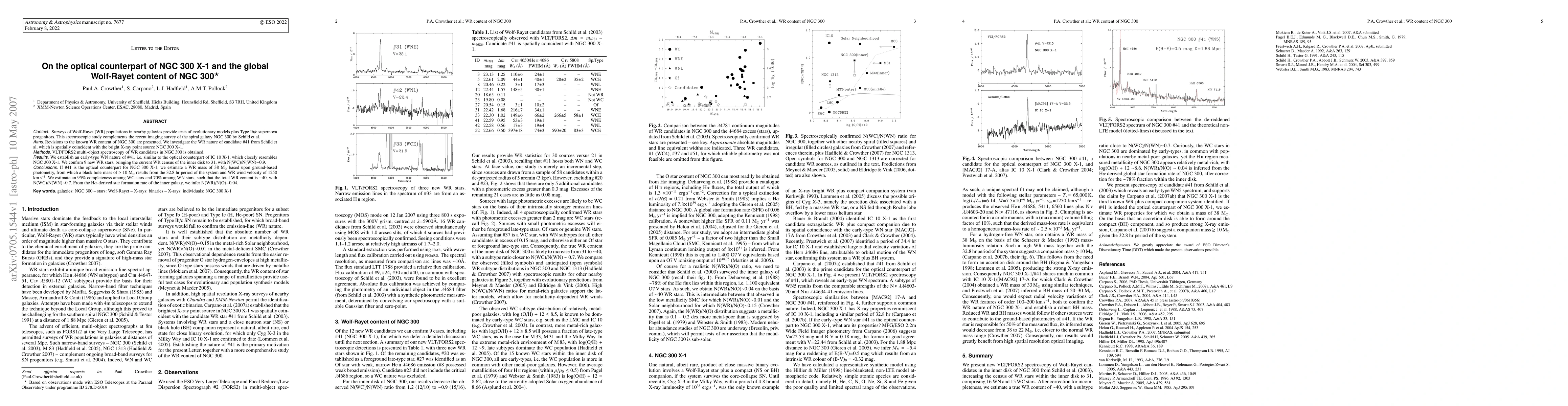 This paper investigates Wolf-Rayet (WR) stars in the nearby spiral galaxy NGC 300, focusing on candidate #41, which may be the optical counterpart of the X-ray source NGC 300 X-1. Using VLT spectroscopy, the study confirms #41 as an early-type WN star, revises the WR population count, and suggests implications for the mass of a potential black hole in the system.