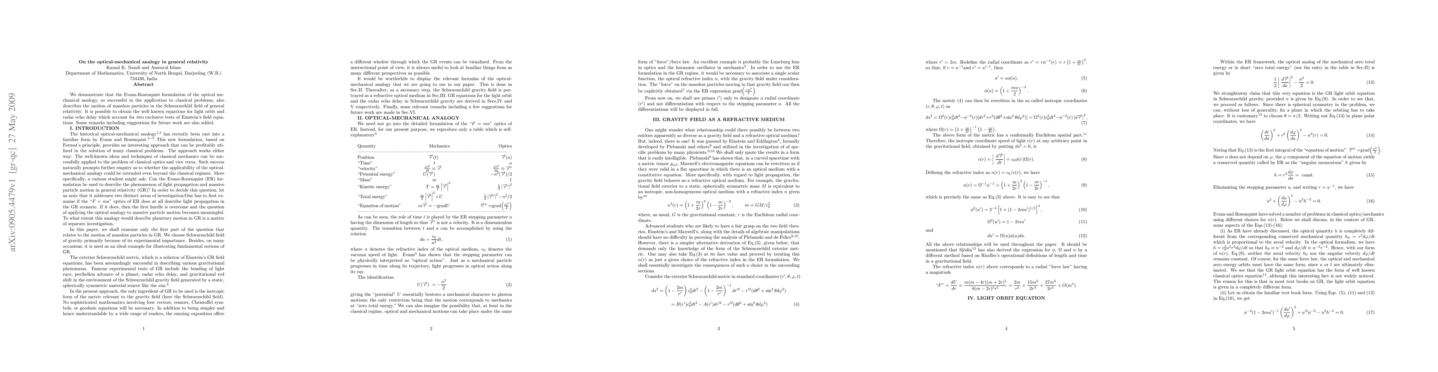 This paper shows that the Evans-Rosenquist optical-mechanical analogy effectively describes massless particle motion in a Schwarzschild field, yielding known equations for light orbit and radar echo delay, thus validating Einstein's field equations. Future work suggestions are included.