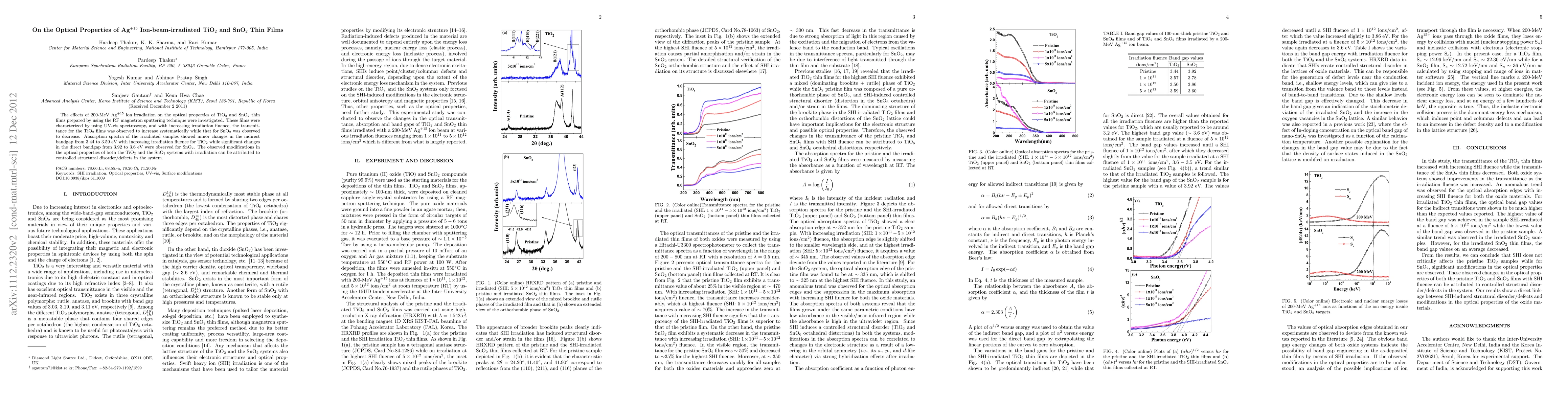 This study investigates the optical properties of TiO_{2} and SnO_{2} thin films after exposure to 200-MeV Ag^{+15} ion irradiation, revealing increased transmittance in TiO_{2} and decreased in SnO_{2}. The irradiation causes minor changes in the TiO_{2} bandgap and significant changes in the SnO_{2} bandgap, suggesting structural disorder/defects induced by the irradiation.