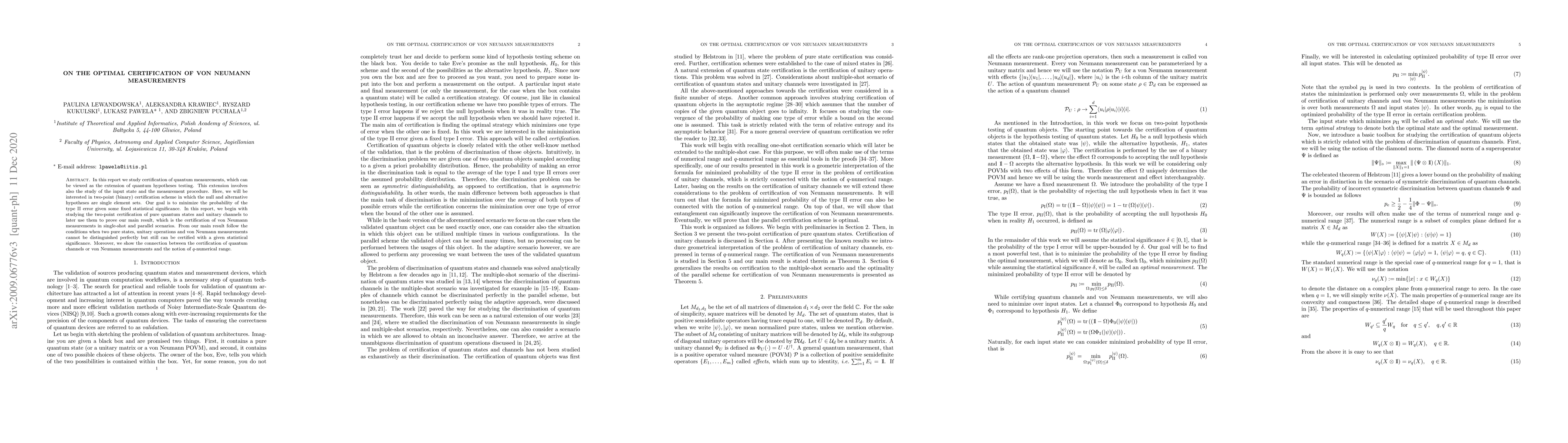 In this report we study certification of quantum measurements, which can be viewed as the extension of quantum hypotheses testing. This extension involves also the study of the input state and the measurement procedure. Here, we will be interested in two-point (binary) certification scheme in which the null and alternative hypotheses are single element sets. Our goal is to minimize the probability of the type II error given some fixed statistical significance. In this report, we begin with studying the two-point certification of pure quantum states and unitary channels to later use them to prove our main result, which is the certification of von Neumann measurements in single-shot and parallel scenarios. From our main result follow the conditions when two pure states, unitary operations and von Neumann measurements cannot be distinguished perfectly but still can be certified with a given statistical significance. Moreover, we show the connection between the certification of quantum channels or von Neumann measurements and the notion of $q$-numerical range.