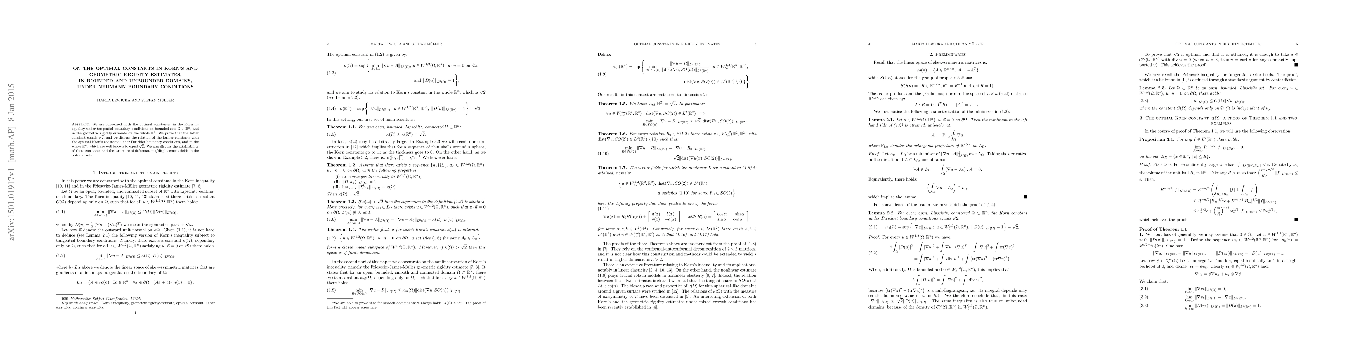 This paper investigates the optimal constants in Korn's inequality and geometric rigidity estimates, proving the geometric rigidity constant in $\mathbb{R}^2$ is $\sqrt{2}$. It also explores the relation between these constants under different boundary conditions and discusses the attainability and structure of optimal deformations.
