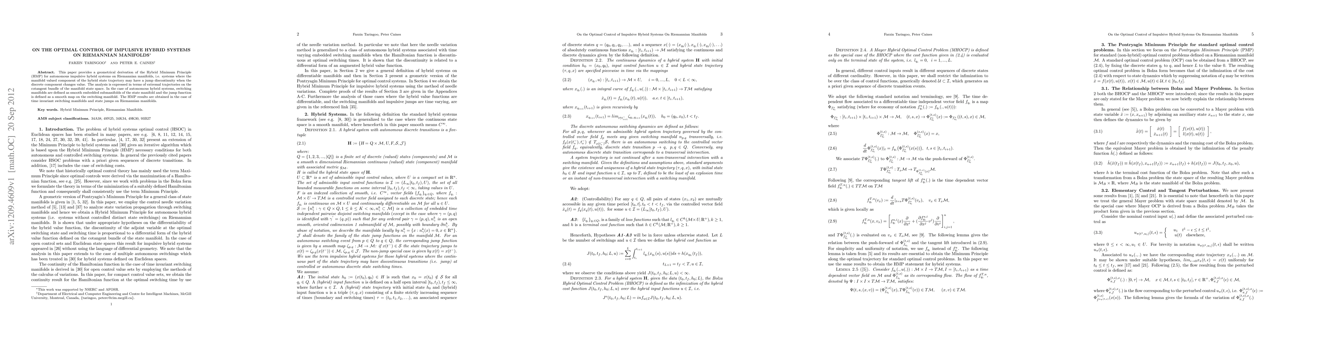 This paper introduces a geometrical derivation of the Hybrid Minimum Principle for autonomous impulsive hybrid systems on Riemannian manifolds, providing a framework for optimal control in switched systems with jump discontinuities.