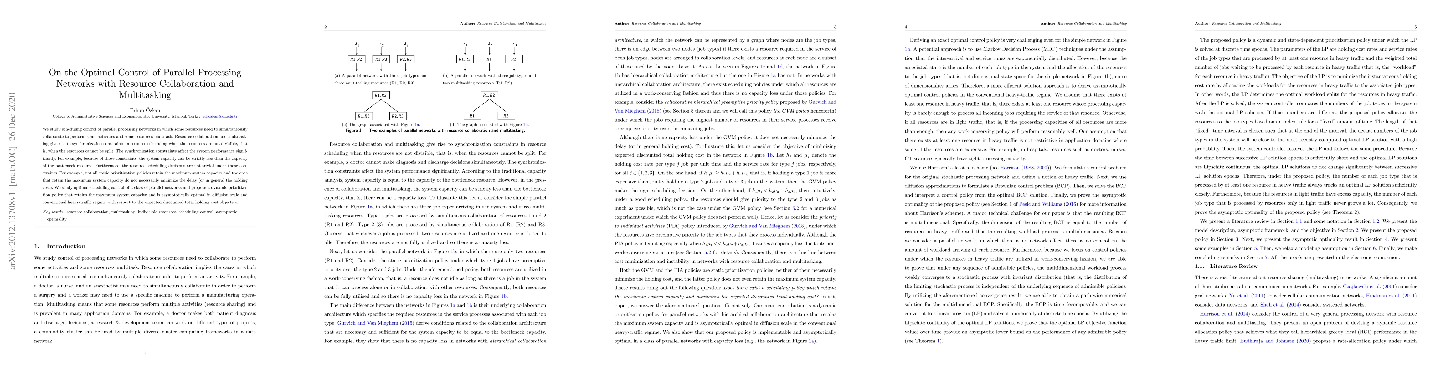 This paper investigates optimal scheduling control in parallel processing networks with resource collaboration and multitasking, focusing on synchronization constraints due to non-divisible resources. The authors propose a dynamic prioritization policy that maximizes system capacity and is asymptotically optimal concerning the expected discounted total holding cost.