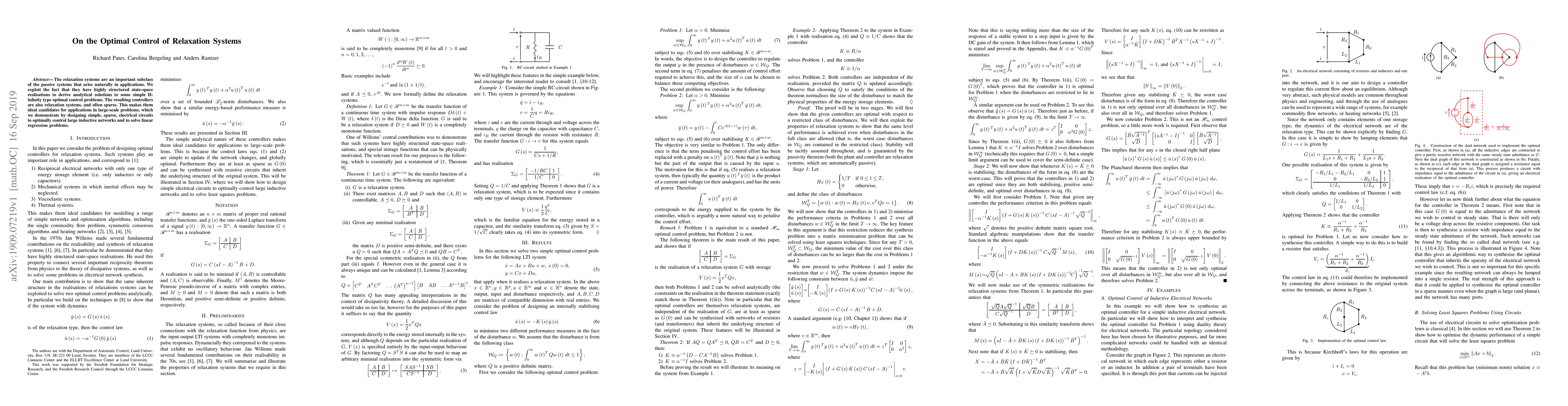The relaxation systems are an important subclass of the passive systems that arise naturally in applications. We exploit the fact that they have highly structured state-space realisations to derive analytical solutions to some simple H-infinity type optimal control problems. The resulting controllers are also relaxation systems, and often sparse. This makes them ideal candidates for applications in large-scale problems, which we demonstrate by designing simple, sparse, electrical circuits to optimally control large inductive networks and to solve linear regression problems.