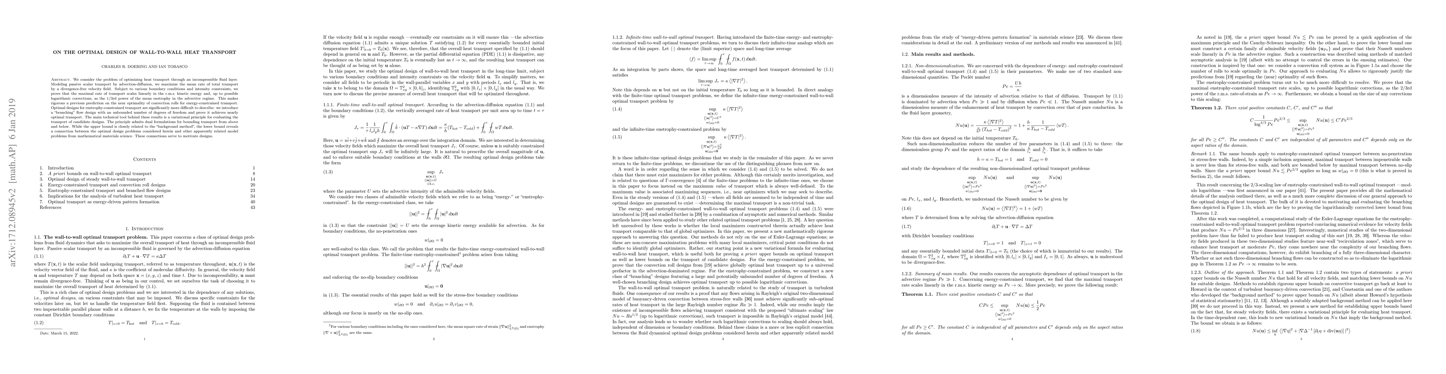 We consider the problem of optimizing heat transport through an incompressible fluid layer. Modeling passive scalar transport by advection-diffusion, we maximize the mean rate of total transport by a divergence-free velocity field. Subject to various boundary conditions and intensity constraints, we prove that the maximal rate of transport scales linearly in the r.m.s. kinetic energy and, up to possible logarithmic corrections, as the $1/3$rd power of the mean enstrophy in the advective regime. This makes rigorous a previous prediction on the near optimality of convection rolls for energy-constrained transport. Optimal designs for enstrophy-constrained transport are significantly more difficult to describe: we introduce a "branching" flow design with an unbounded number of degrees of freedom and prove it achieves nearly optimal transport. The main technical tool behind these results is a variational principle for evaluating the transport of candidate designs. The principle admits dual formulations for bounding transport from above and below. While the upper bound is closely related to the "background method", the lower bound reveals a connection between the optimal design problems considered herein and other apparently related model problems from mathematical materials science. These connections serve to motivate designs.