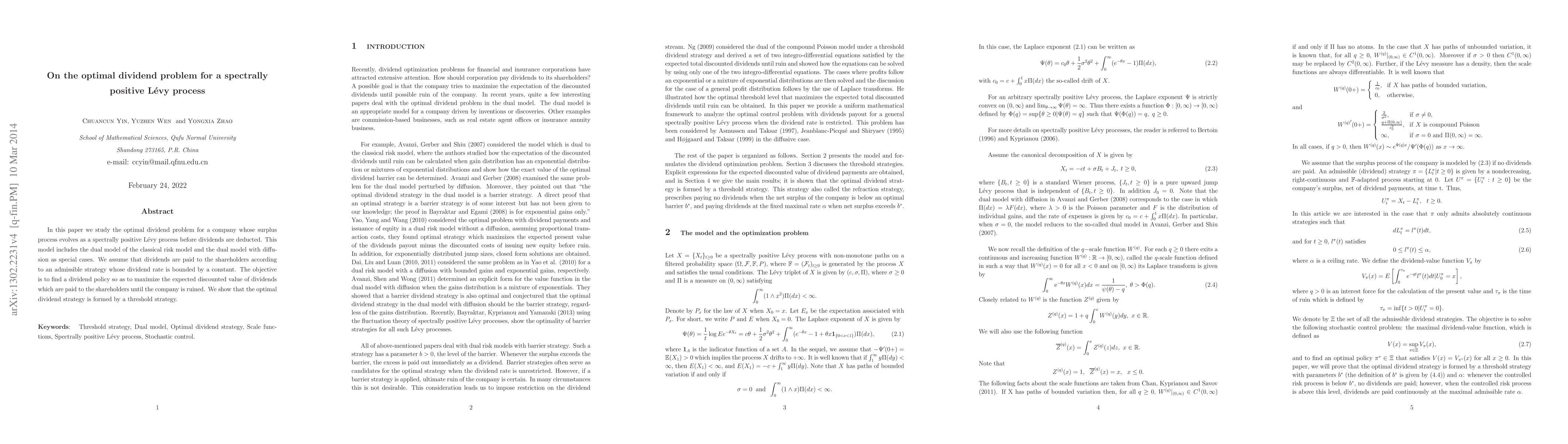 This paper investigates the optimal dividend problem for a company modeled by a spectrally positive Lévy process, aiming to maximize the expected discounted value of dividends before ruin. The authors demonstrate that the optimal strategy involves a threshold policy.