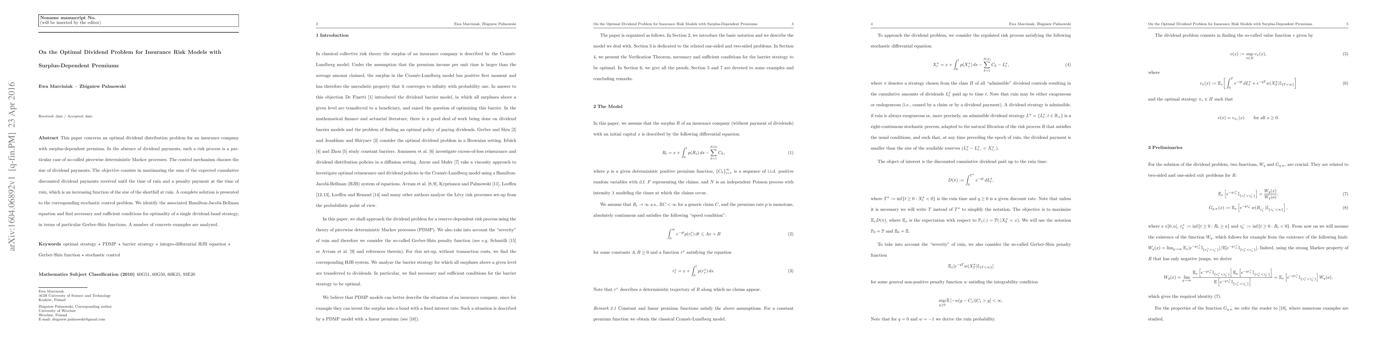 This paper concerns an optimal dividend distribution problem for an insurance company with surplus-dependent premium. In the absence of dividend payments, such a risk process is a particular case of so-called piecewise deterministic Markov processes. The control mechanism chooses the size of dividend payments. The objective consists in maximazing the sum of the expected cumulative discounted dividend payments received until the time of ruin and a penalty payment at the time of ruin, which is an increasing function of the size of the shortfall at ruin. A complete solution is presented to the corresponding stochastic control problem. We identify the associated Hamilton-Jacobi-Bellman equation and find necessary and sufficient conditions for optimality of a single dividend-band strategy, in terms of particular Gerber-Shiu functions. A number of concrete examples are analyzed.