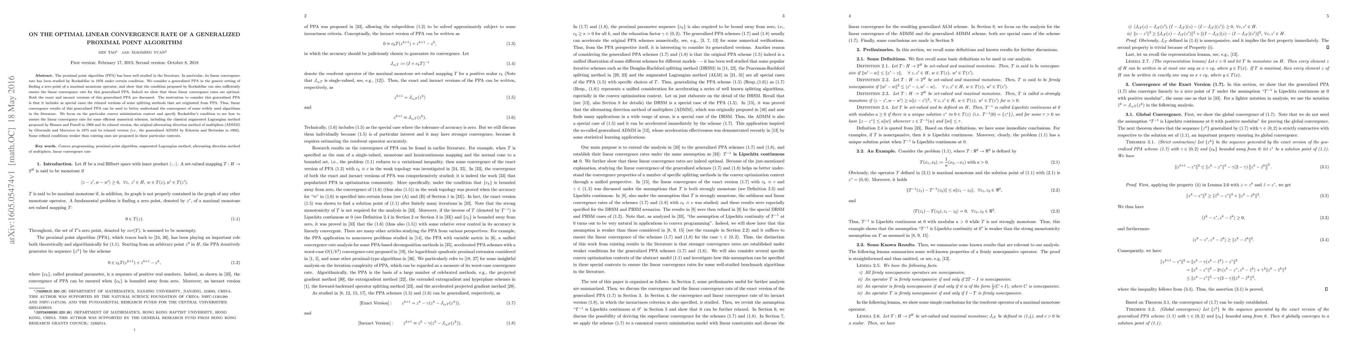 This paper investigates the optimal linear convergence rate of a generalized proximal point algorithm (PPA) for finding zero points of maximal monotone operators, showing that Rockafellar's 1976 condition ensures this rate. It also proposes refined conditions for specific algorithms like the augmented Lagrangian method and ADMM, demonstrating their optimal linear convergence.