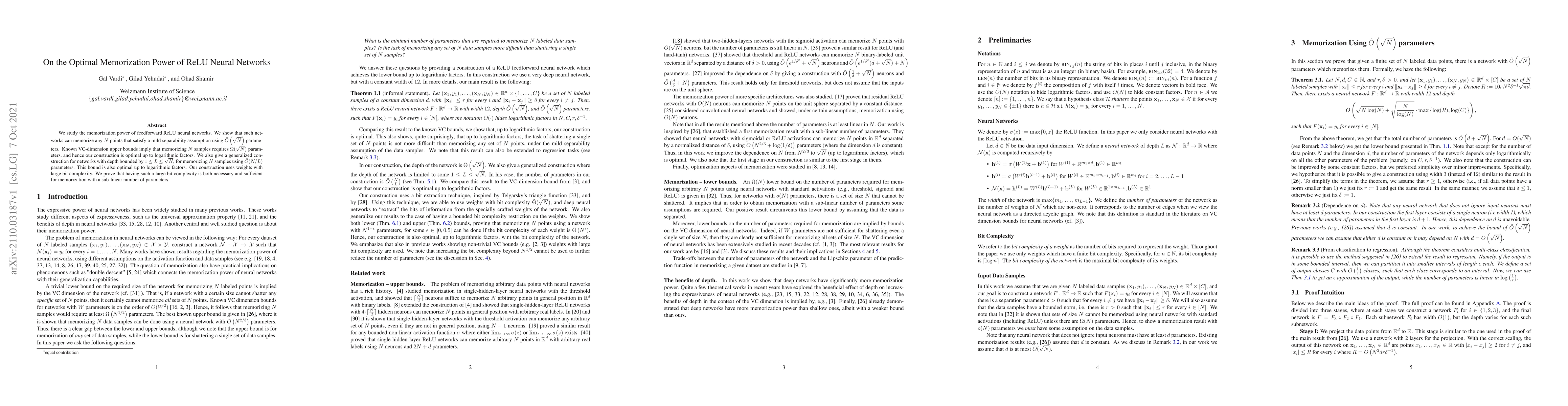 This paper demonstrates that ReLU neural networks can memorize any set of $N$ separable points using $\tilde{O}(\sqrt{N})$ parameters, matching known VC-dimension bounds. It also presents an optimal construction for networks with bounded depth, requiring $\tilde{O}(N/L)$ parameters for $L$-depth networks, proving that large weight bit complexity is necessary and sufficient for such memorization.