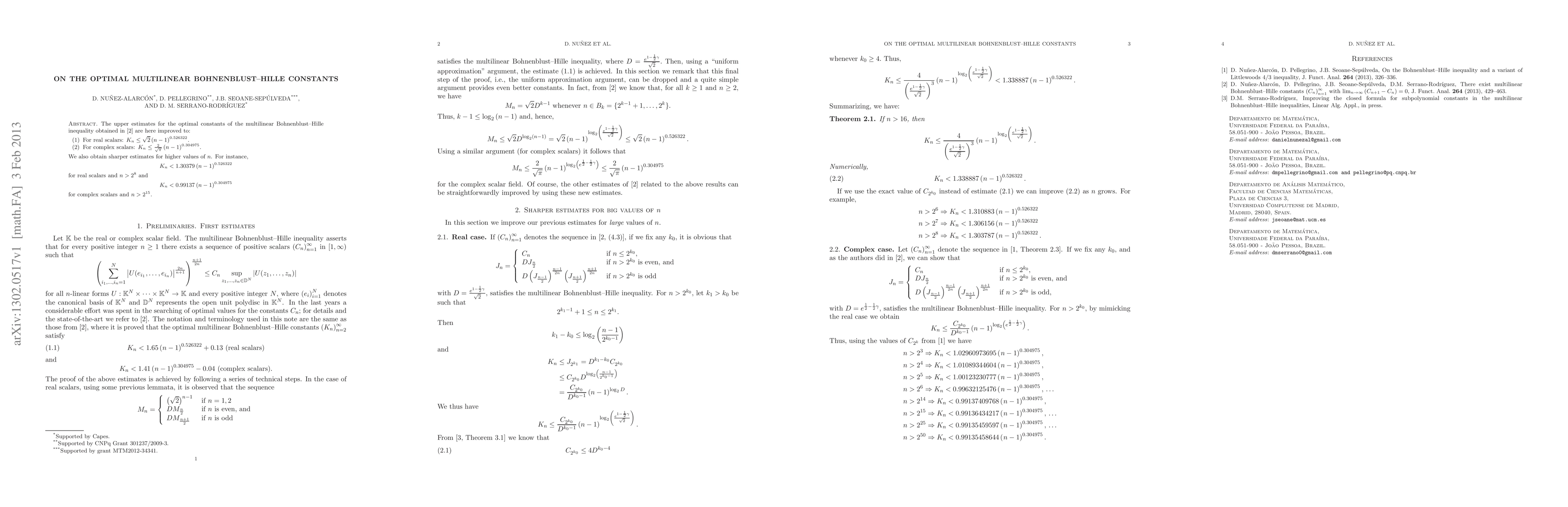 This paper improves upper estimates for the optimal multilinear Bohnenblust-Hille constants, providing tighter bounds for both real and complex scalars, specifically $K_{n}\leq\sqrt{2}(n-1)^{0.526322}$ for real and $K_{n}\leq\frac{2}{\sqrt{\pi}}(n-1)^{0.304975}$ for complex scalars, along with sharper estimates for higher values of $n$.