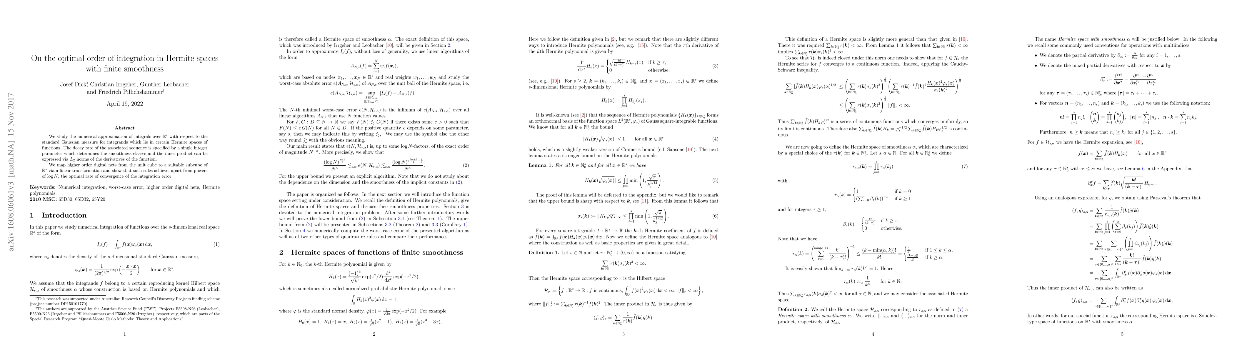 We study the numerical approximation of integrals over $\mathbb{R}^s$ with respect to the standard Gaussian measure for integrands which lie in certain Hermite spaces of functions. The decay rate of the associated sequence is specified by a single integer parameter which determines the smoothness classes and the inner product can be expressed via $L_2$ norms of the derivatives of the function. We map higher order digital nets from the unit cube to a suitable subcube of $\mathbb{R}^s$ via a linear transformation and show that such rules achieve, apart from powers of $\log N$, the optimal rate of convergence of the integration error.