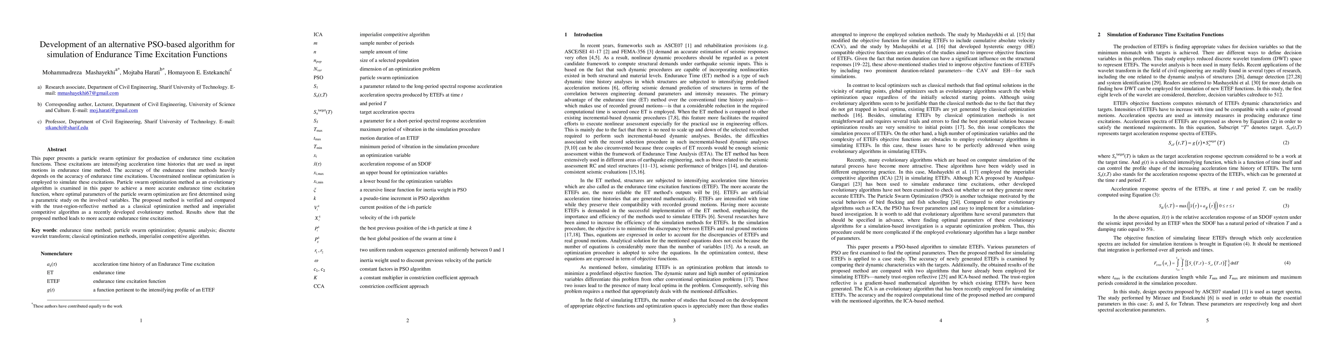 This paper develops a particle swarm optimization (PSO) algorithm to generate accurate endurance time excitation functions, crucial for endurance time methods. Optimal PSO parameters are determined through a parametric study, and the method is shown to outperform classical and recent evolutionary optimization methods.